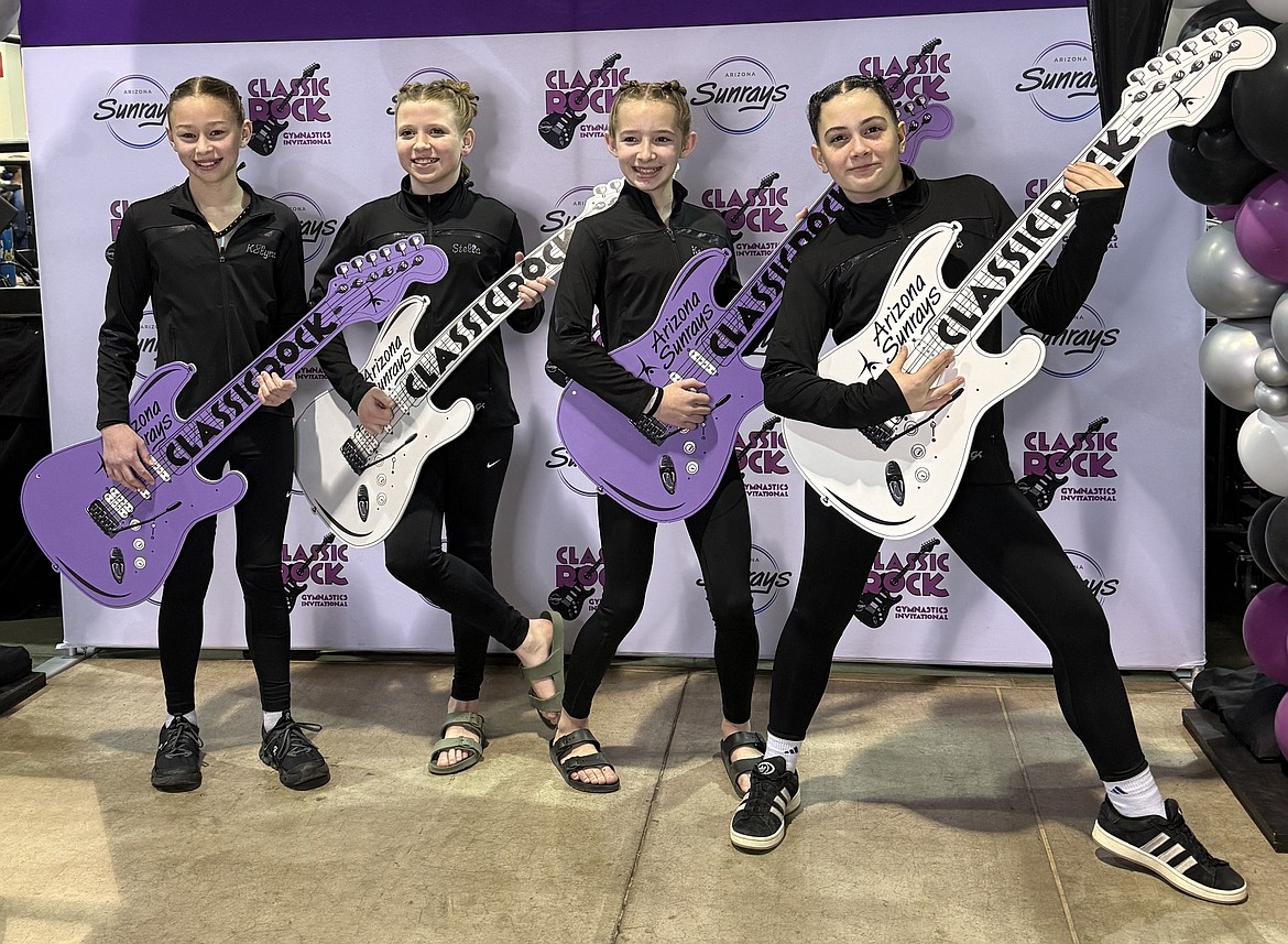 Courtesy photo Technique Gymnastics Xcel Golds attended The Classic Rock Invitational in Phoenix. From left are Clara Stoffer, high score on Vault 8.675; Camille Kingsley, 5th on Beam 8.85; Sierra Martin, high score on Floor 8.55; and Elise Cope, high score on Bars 9.3.