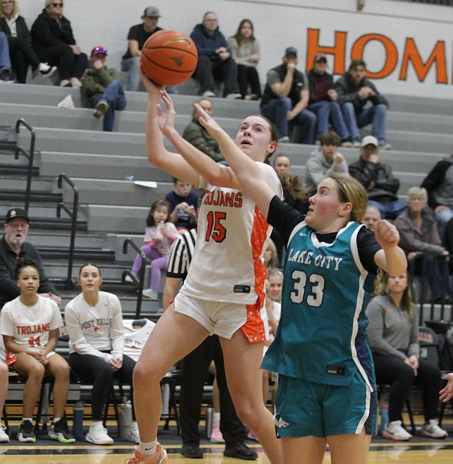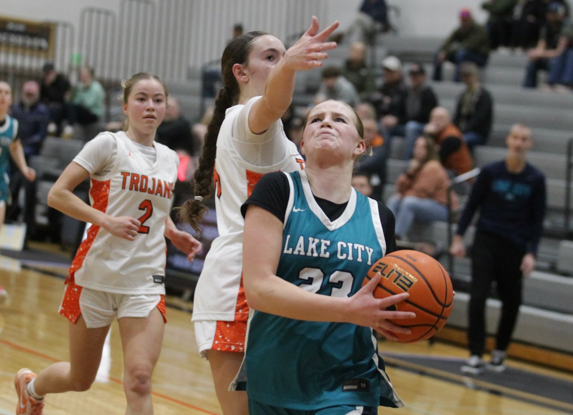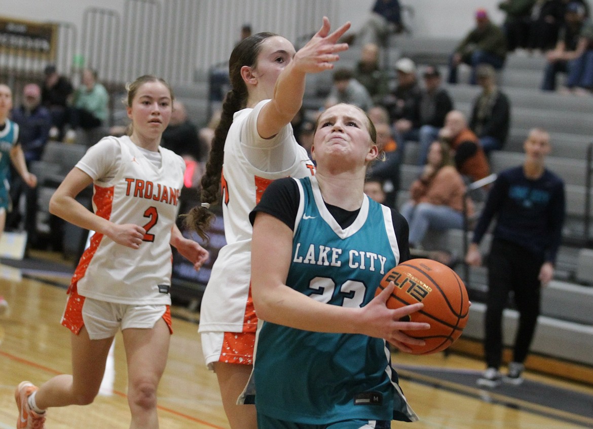 “What got us back in the game was our defense,” Carlson said. “We were down with 1:30 to go, and I told them that Lake City would go up and down, and they had their little dip there, and our girls got after it on the defensive end and got three or four steals. It was just huge for us. We had huge contributions off our bench. Gracie (Glukak) didn’t play in the third quarter, but got a couple of baskets in the fourth quarter. Rylan (Morrison), she’s one of our swing players, and she had to play some big minutes and Olivia (Hollenbeck) had to move to the point guard and did a good job of getting us into our sets.”