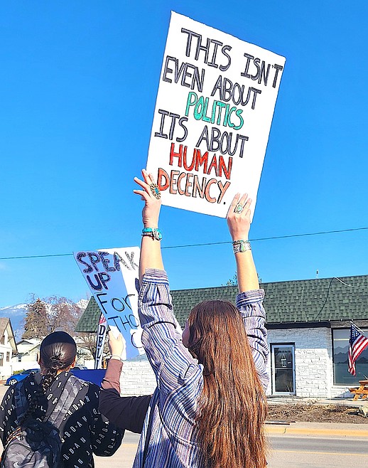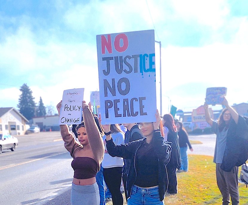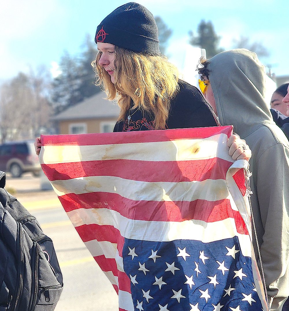 Students stayed on the side of 4th Ave. E. until they crossed Round Butte Road and then marched on city sidewalks to the Ronan Chamber of Commerce’s visitor center parking lot. There, they piled up their backpacks and jackets, then held their signs high and lined the west side of Hwy. 93, continuing to chant.