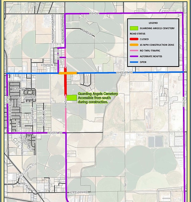 The detour back to Road L on the north side of the intersection will be on Bell Road Northeast, which can be accessed either from Debonair Street Northeast or Bonanza Street. The south side detour will be East Nelson Road to Kittleson Road. The Guarding Angels Cemetery will only be accessible from the south.