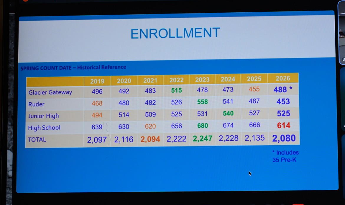 In the elementary schools, Ruder Elementary is down 34 over last year, but Glacier Gateway is up 33 over last year, but because it started a pre-K program.