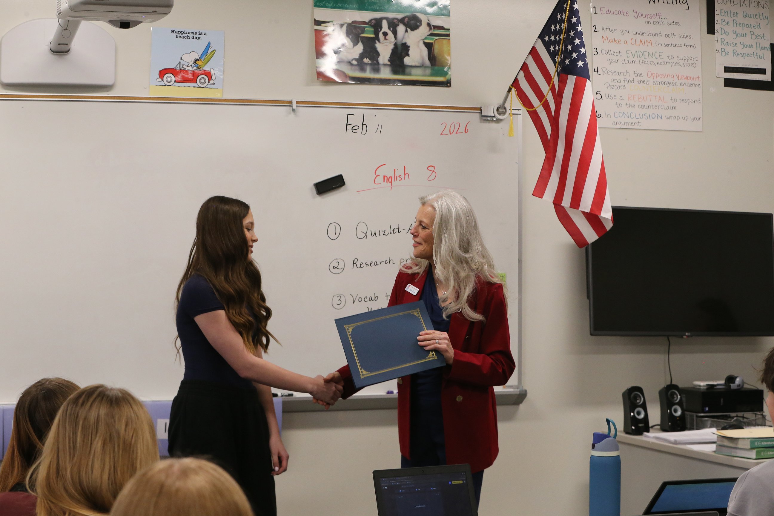 She was celebrated in class on Thursday, Feb. 12, as DAR Pleasantview Chapter Regent Trina Caudle presented her with a bronze medal, a certificate and a monetary prize.