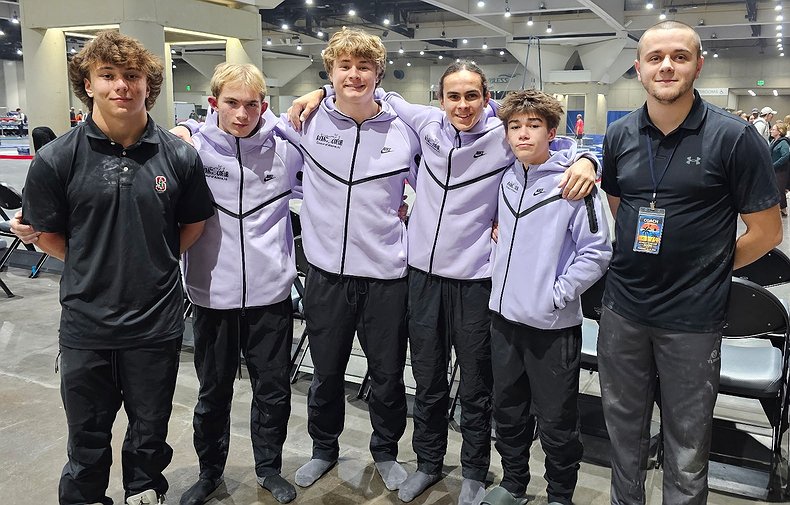 Courtesy photo Avant Coeur Gymnastics Level 10s take 3rd Place Team in San Diego at the Azarian Classic. From left are Conan Tapia, Quinn Maier, Lance Mosher, Dylan Abrahamson-Fernandez, Dylan Coulson and Jon Malstrom.