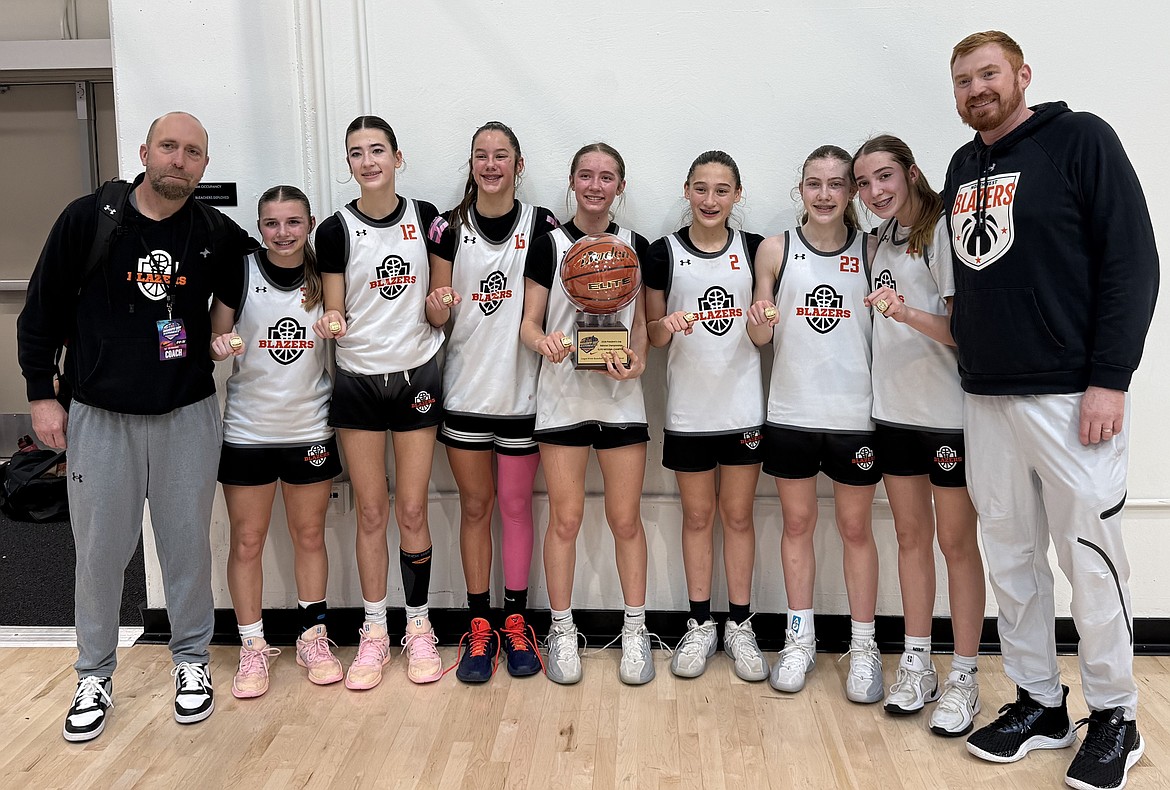 Courtesy photo The seventh grade Hooptown Blazers won the President National tournament this past weekend in Portland. The team went 6-0 on the weekend, winning in the final seconds one game and scoring over 100 in one game while hitting 13 of 19 from 3-point range. The Blazers defeated FOH from Seattle in the finals. From left are coach Brian Carslon, Addison Salas, Brylee Brown, Ellie Rohrbacher, Reagan Posthumus, Addy Pendergraft, Jayden Jeske, Kyal Carlson and coach David Pendergraft.
