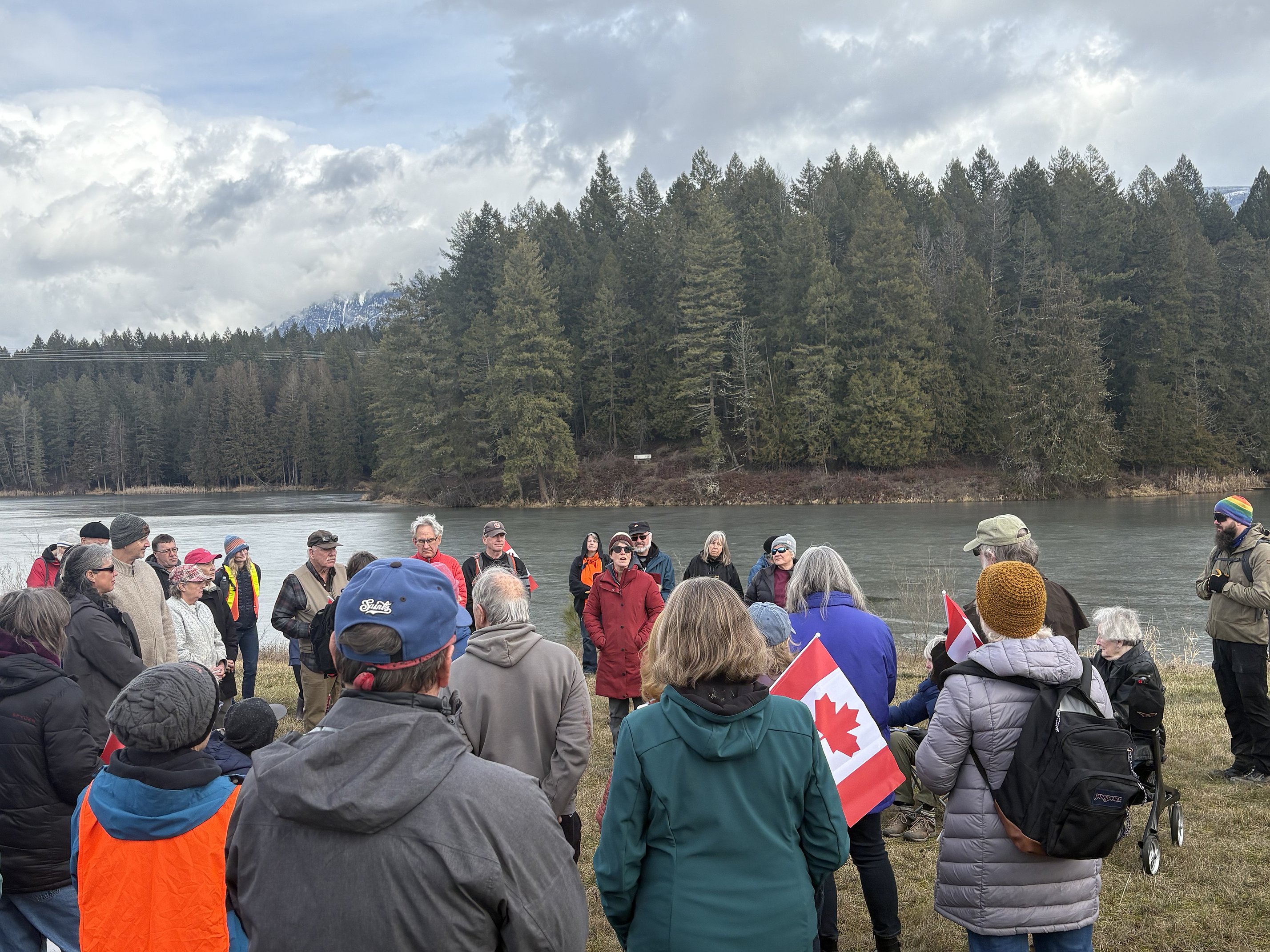 A group of Americans walked from Jake’s Landing at Porthill to meet with Canadians at the boundary between the two countries, gathering in the space on a grassy bank overlooking a lake between the border stations. About 80 people attended, with more participants coming from Canada.