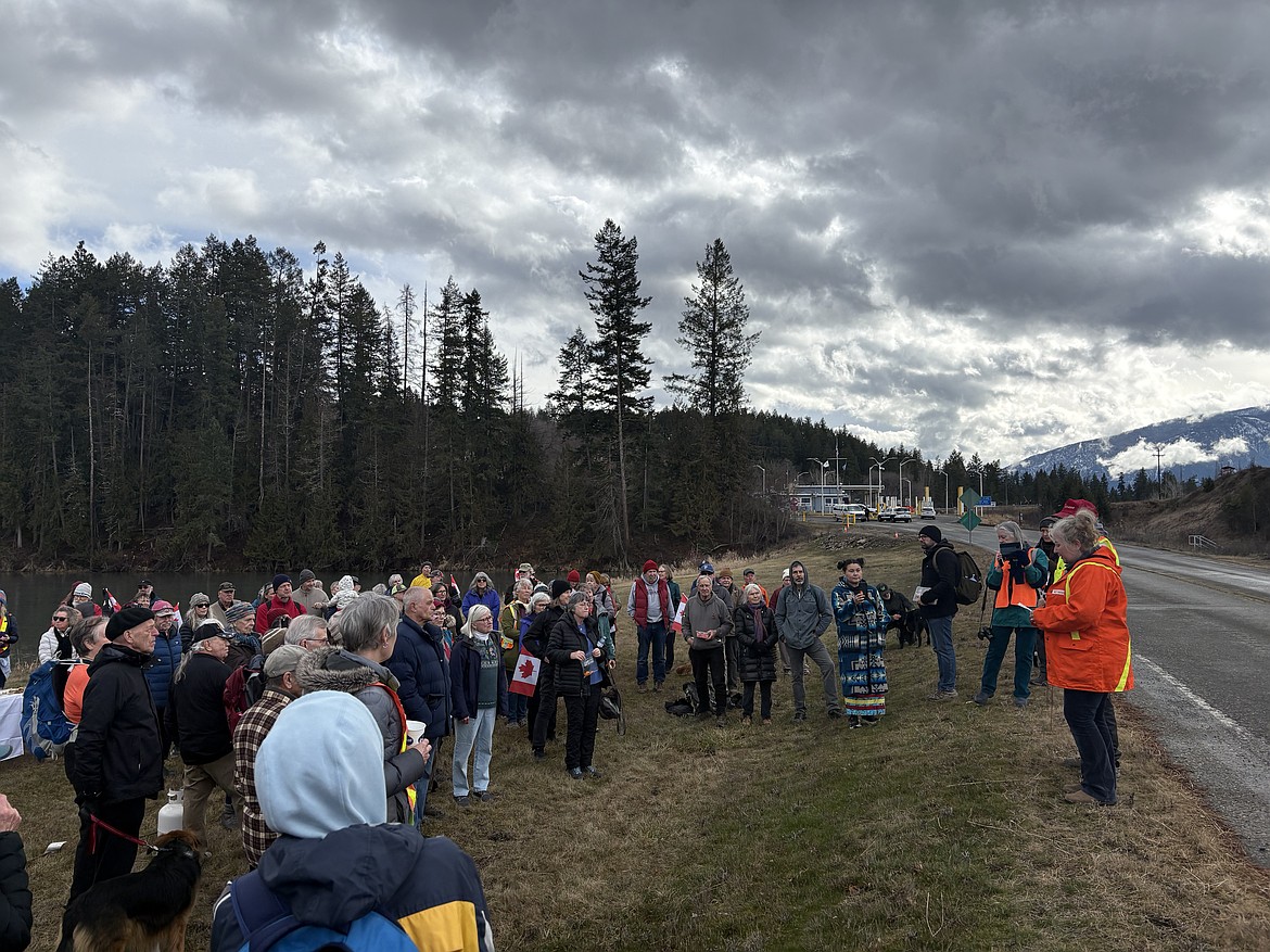 A group of Americans walked from Jake’s Landing at Porthill to meet with Canadians at the boundary between the two countries, gathering in the space on a grassy bank overlooking a lake between the border stations. About 80 people attended, with more participants coming from Canada.