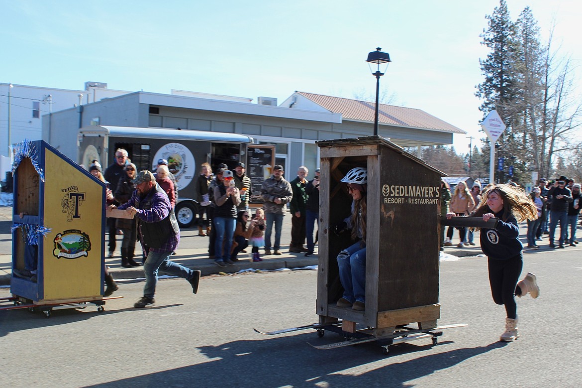 Without enough snow for a track, Spirit Lake’s annual Outhouse Races looked a bit different this year. Rather than slipping and sliding across packed powder on skis in City Park, the outhouses instead careened down 4th Avenue on furniture dollies.