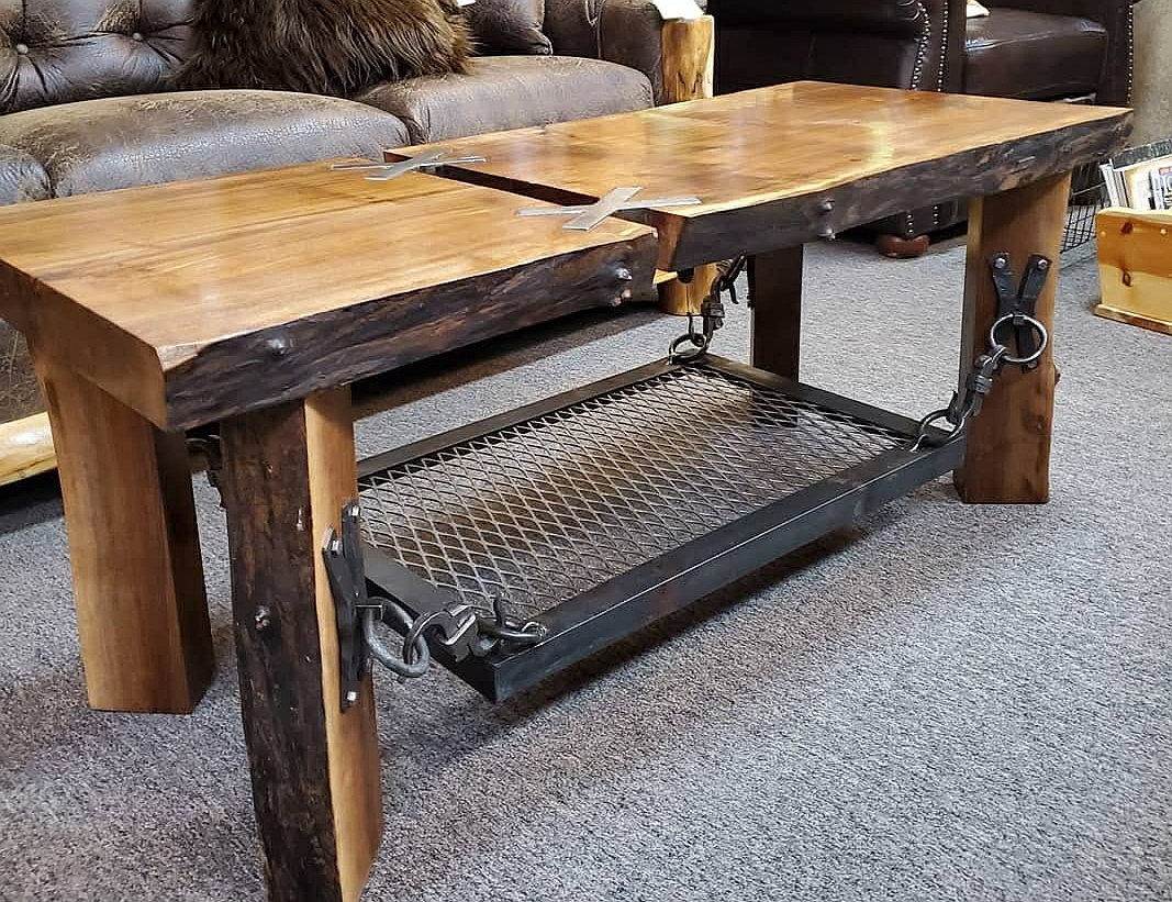 What began with furniture soon expanded — knife making, blacksmithing, metal forging, and eventually full-scale custom furniture. Anthony’s pieces today include dining tables, coffee tables, trunks, decorative ironwork, and his now‑beloved “whimsical” creations that blend the rustic with the artistic.