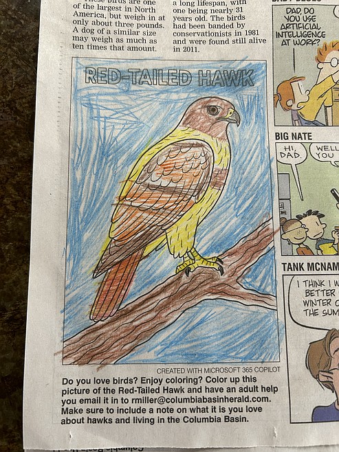 Eleven-year-old Ashlynn colored this picture of a red-tailed hawk from last week’s Columbia Basin Herald Kids News. Ashlynn is thankful that the hawks keep the rodent population down, she said.