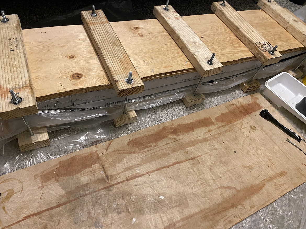 The boards begin with a P-Tex base, followed by layers of fiberglass, resin and veneer. After three days of shaping in the press, the boards are stained, clear coated, and a patch of boat decking is applied to provide some grip for the rider.
