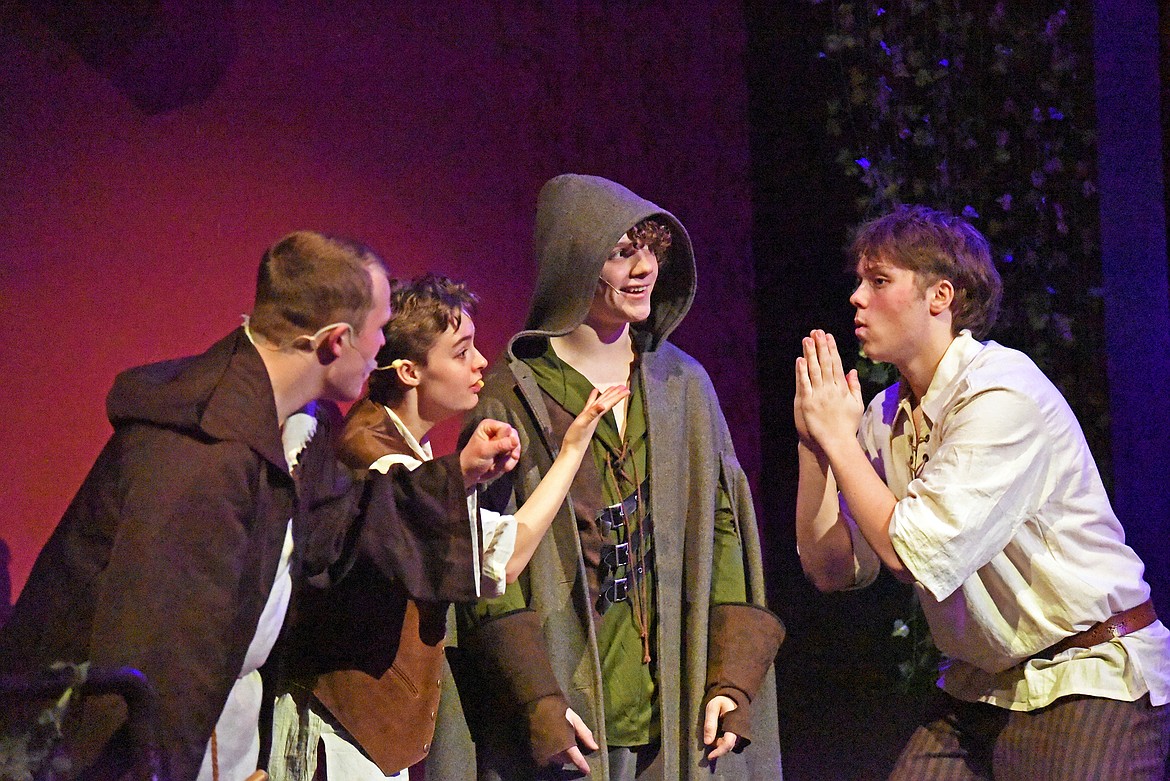 The scene begins deep in the heart of Sherwood Forest, where the audience meets heroic outlaw Robin Hood (Eli Bergeson) and forest people, Friar Tuck (Noah Oaks), Little John (Walker Williams), Will Scarlet (Jasper Chisholm), and Maid Marian (Kalina Bruckerhoff).