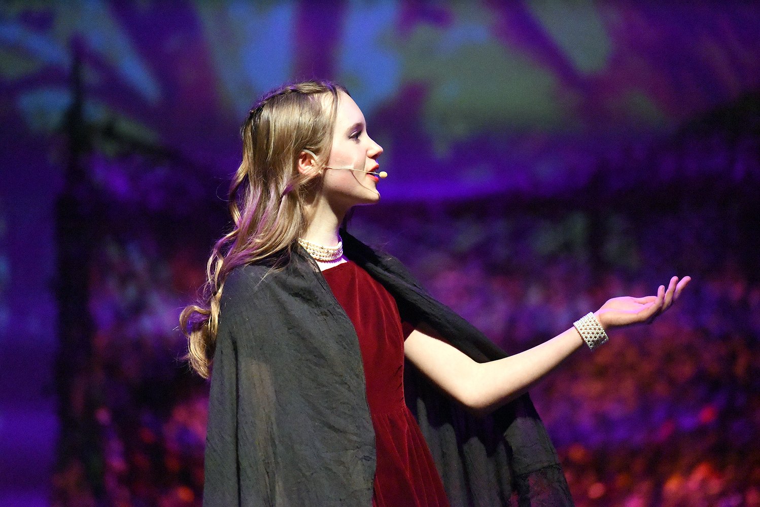 Also joining the good folk of the woods on stage is Annabel (Nadia Reese), Mother Meg (Cody Blaize), Beth (Maya Kelley), and the wise old widow (London Jones).