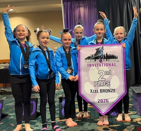 Courtesy photo GEMS Athletic Center Bronze Team placed 2nd overall in the Great Wolf Lodge Invitational gymnastics competition Feb. 21-22 in Centralia, Wash. From left are Ava Puyleart, Brynlee Smith, Harlee Wynand, Abigail Denisyuk, Chloe Foreman and Millie Ferguson.