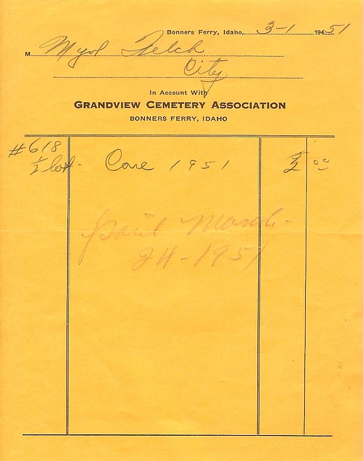 Myrl Felch received this bill from the Grandview Cemetery Association on March 3, 1951. It was a bill for $2.00 from the “caretaker” who had done some upkeep on half of lot #618, where his parents had been laid to rest ten years earlier.
