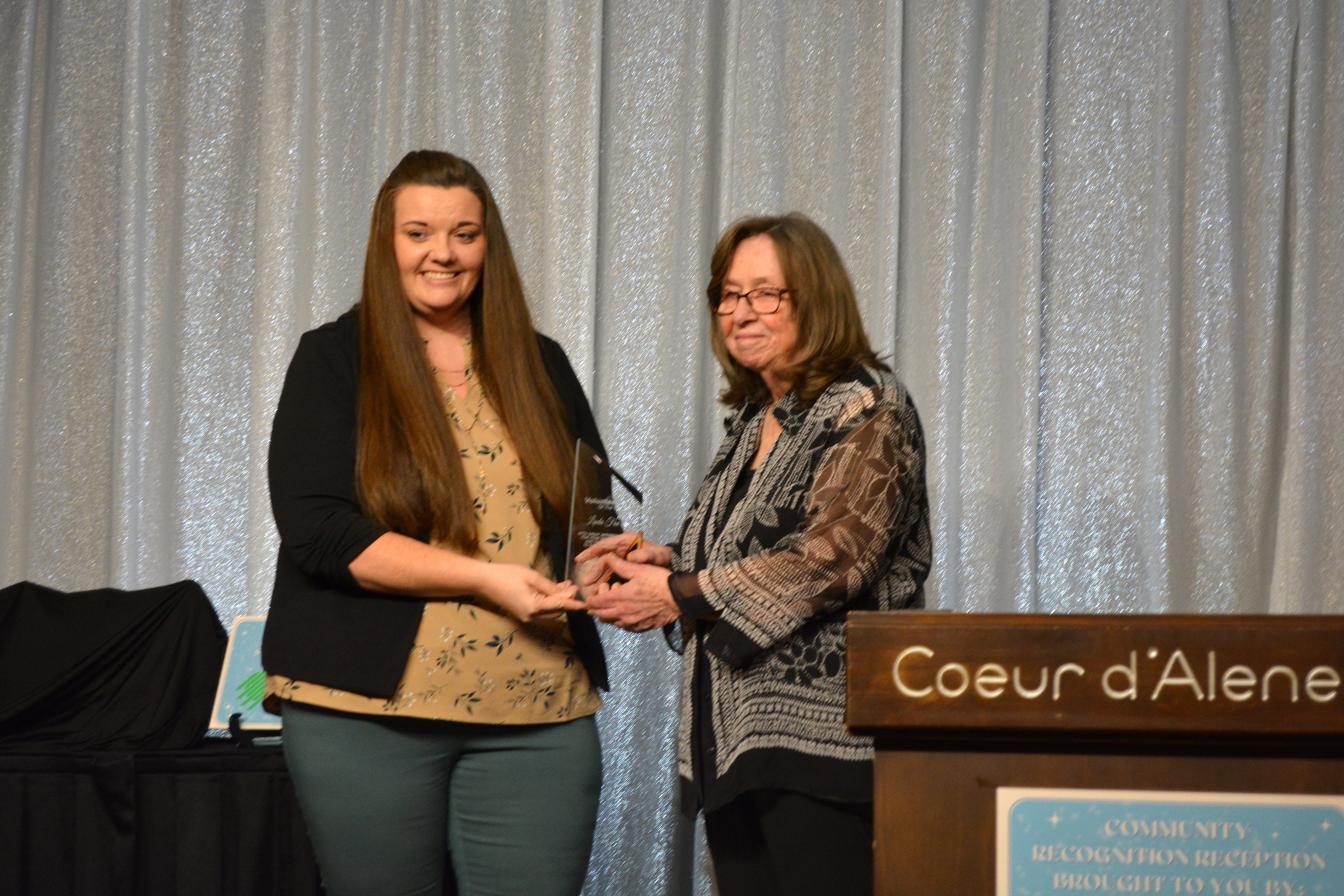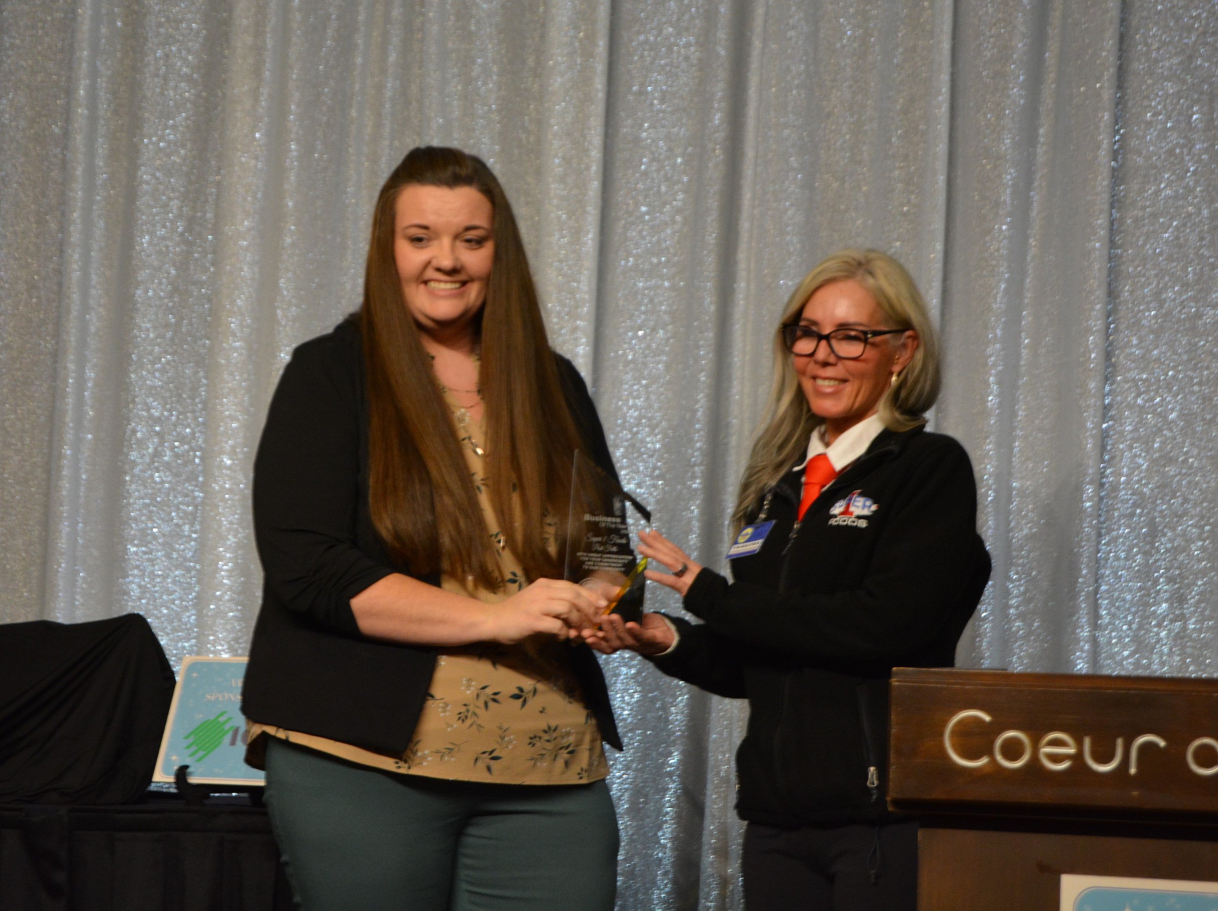 Kassi Allen accepted awards on behalf of both the Red and Blue Foundation (Spirit of Post Falls Award winner) and Anchored Coffee Company (Small Business of the Year Award) for their drive to help first responders in the wake of the Canfield Mountain incident.
