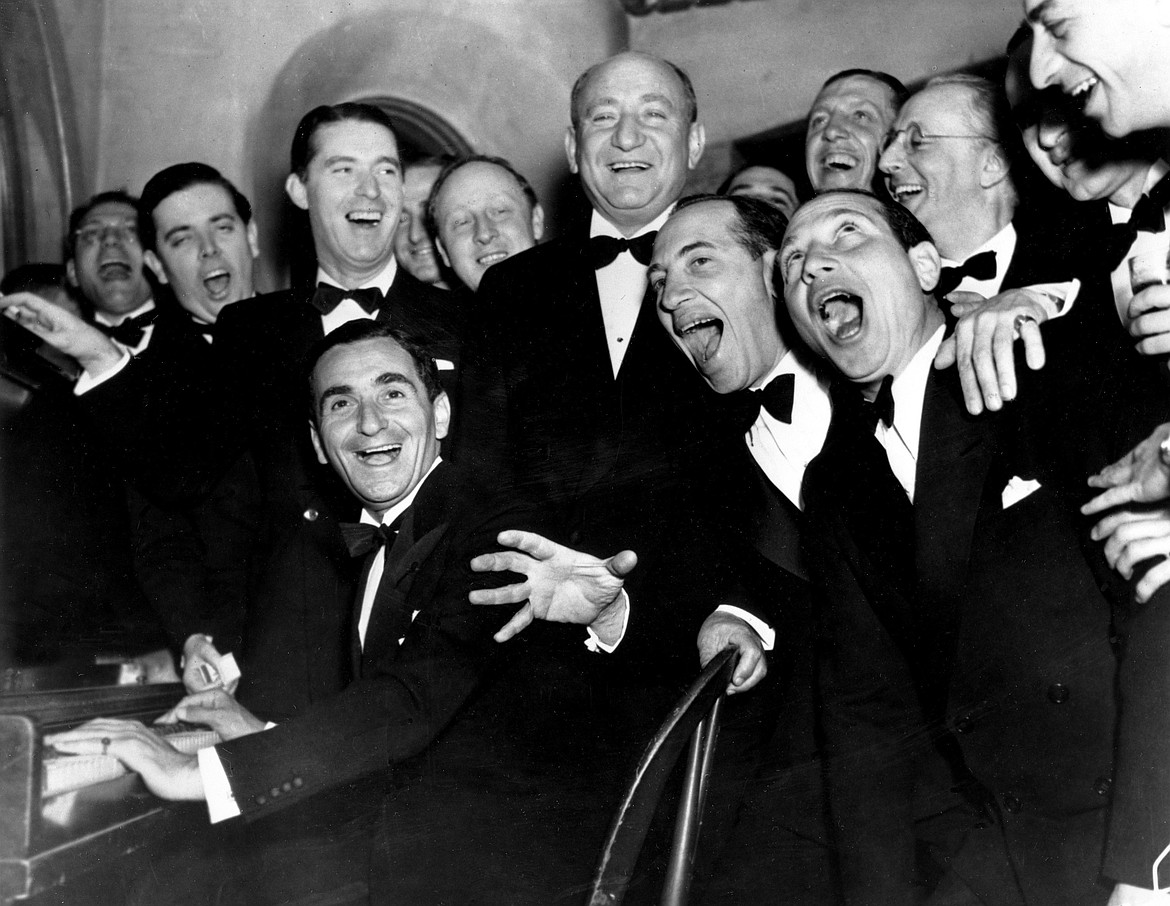 Irving Berlin, at the piano, and friends celebrate his 25th year since he wrote "Alexander's Rag Time Band" at a banquet in his honor in Hollywood, Calif. Jan. 20, 1936. Standing behind Berlin, at right, is Joseph Schenck, film producer. In front row singing together are two of the Marx Brothers, Chico and Harpo.