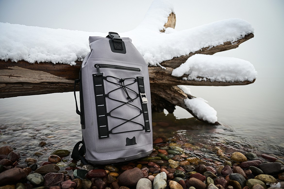 The backpack is laminated, reinforced, and includes removable pockets inside to help with organization. There is also adjustable shock cord webbing on the outside to store wet items.
