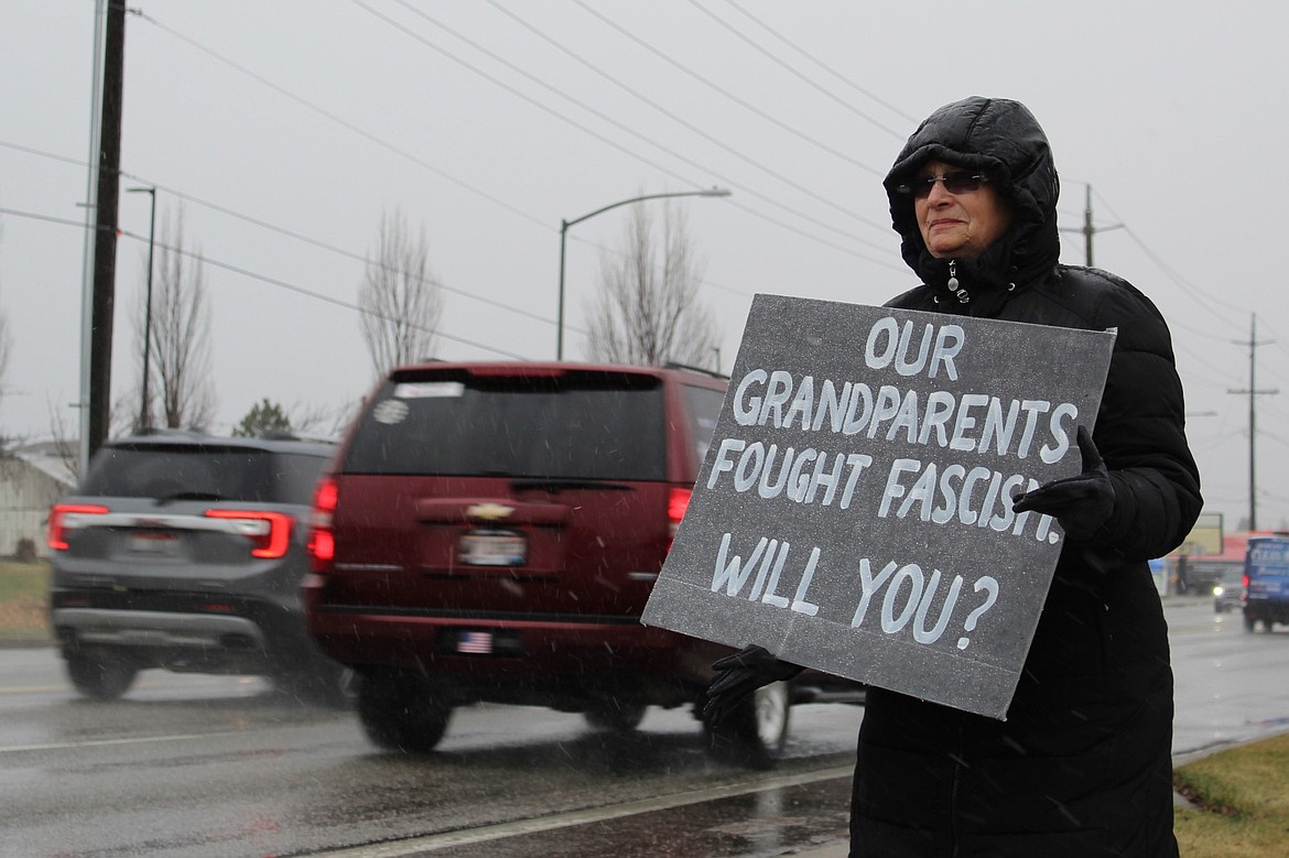 COEUR d'ALENE — As snow and rain began to fall Tuesday, about a dozen people stood in solidarity along Government Way holding signs. The words "Signs of Fascism" accompanied varying slogans.