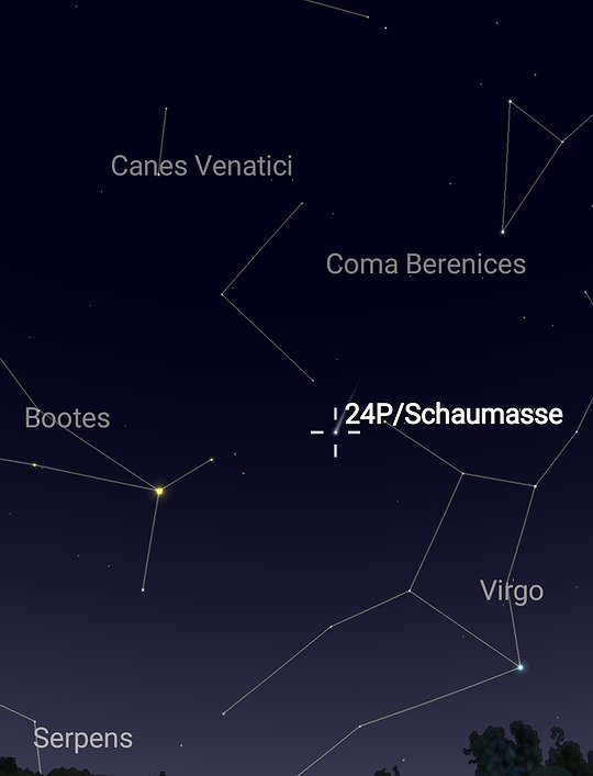 Comet 24P/Schaumasse is forecasted to reach the brightest point in its 2026 apparition Jan. 7. At that time, it will be a mere 55 million miles from Earth. The comet will be visible in the late night sky, becoming observable above the horizon around 1 a.m., when it reaches an altitude of 21 degrees above your eastern horizon. Look toward the constellations of Bootes, Coma Berenices and Virgo. You will need a pair of binoculars to see this comet because it will be a faint eighth-magnitude object. With your binoculars, find the bright star Arcturus and move it to your right and slightly upwards to see this faint fuzzy patch of light. Good luck!