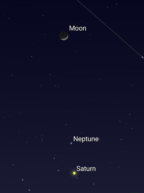 The moon will pass a little over 4 degrees (four fingers held at arm’s length) to the north of Saturn. The moon will be a crescent, and Neptune will be between them, but much closer to Saturn. Both the moon and Saturn will be naked eye objects, but you will need at least a pair of binoculars to see eighth magnitude Neptune. Neptune will be a distinctly bluish pinpoint.