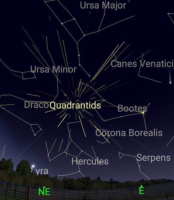 The Quadrantid meteor shower will be active from Dec. 12 to Jan. 12, producing its peak rate of meteors around the 3rd and 4th of January. Over this period, there will be a chance of seeing Quadrantid meteors whenever the shower's radiant point — in the constellation Bootes — is above the horizon, with the number of visible meteors increasing the higher the radiant point is in the sky. The radiant point is highest in the sky after dawn — at around 8 a.m. — and so the shower is likely to produce its best displays shortly before dawn, when its radiant point is highest.