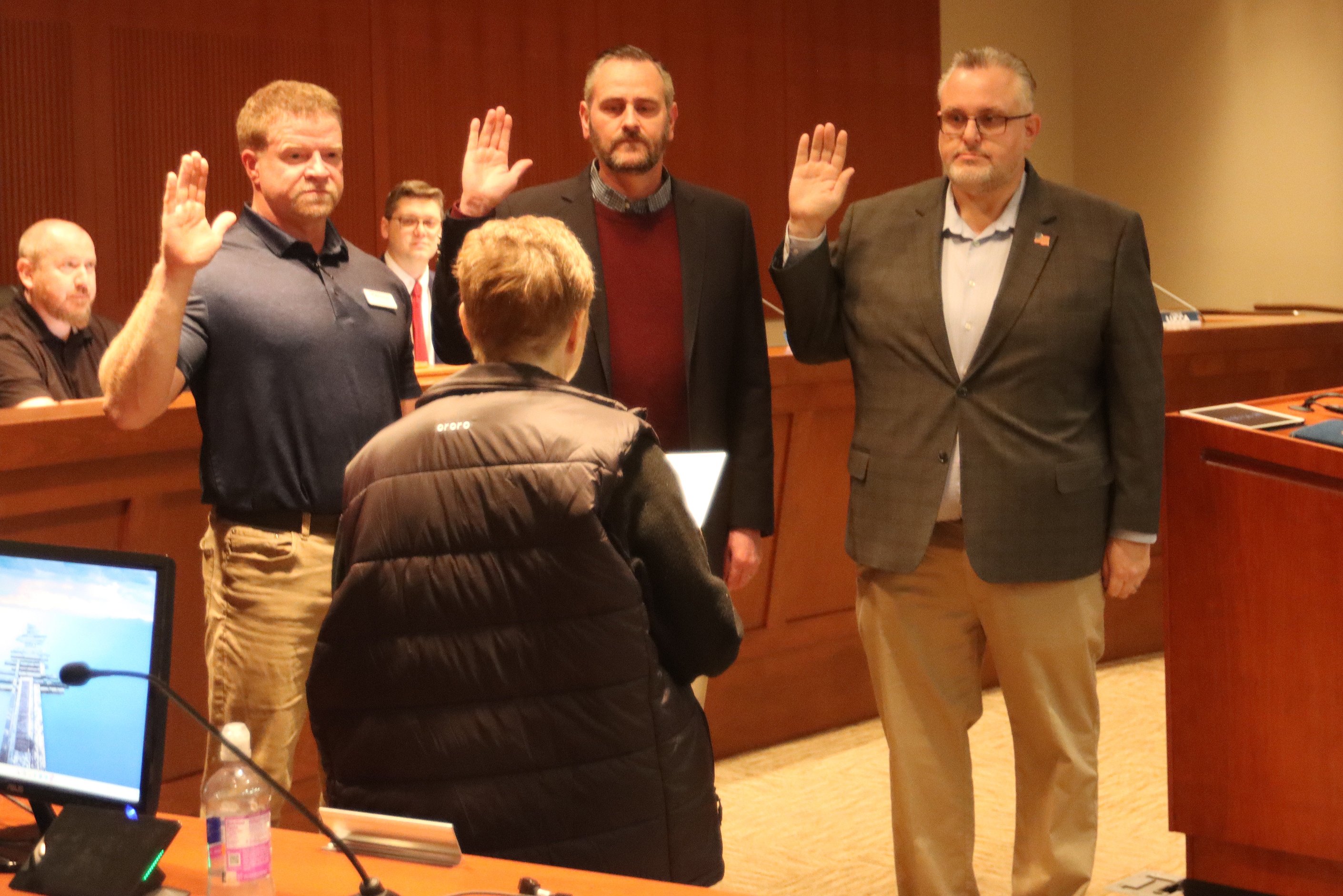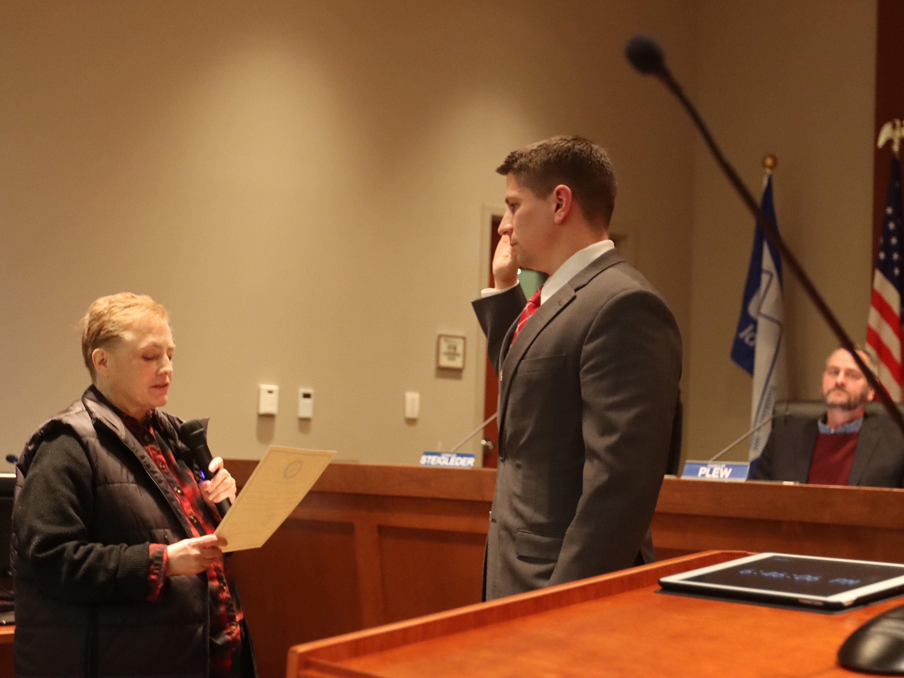 Councilors Aaron Plew, Nathan Ziegler and Marc Lucca were also sworn into office. Then, the business turned to interviewing Mosby to get a sense of his potential position on the council.