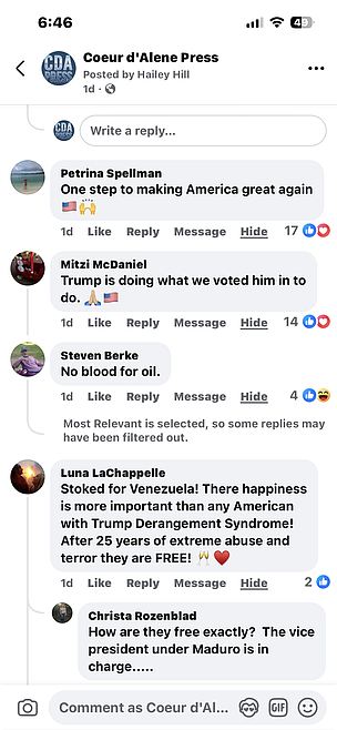 “As a Venezuelan ... (Trump) did what he had to,” wrote Jesus Noria of Athol. “Peace through strength. Many times, we asked the international community to enforce Venezuelan regime, what they did? Nothing ... and at last (on) Jan. 3 the U.S. showed them that the U.S. don’t play games."