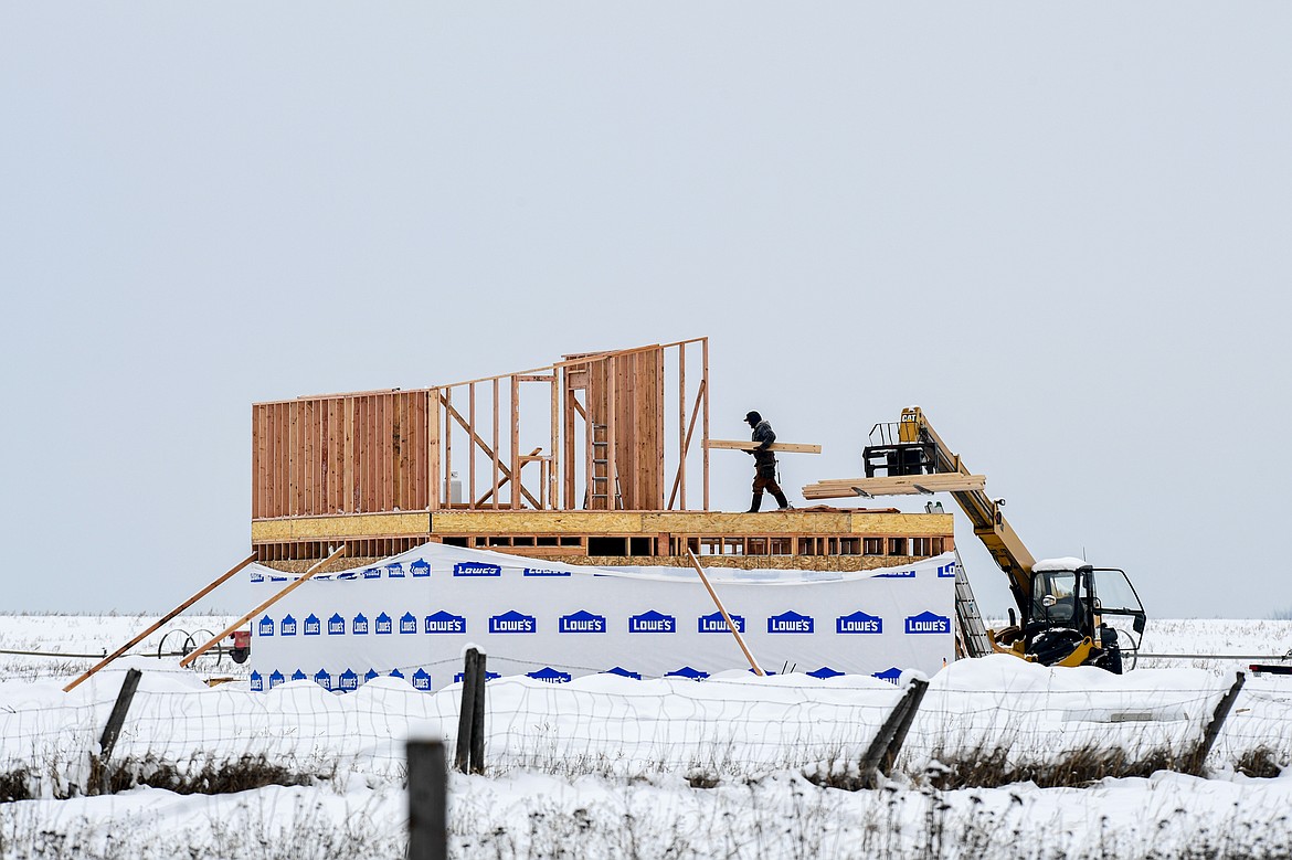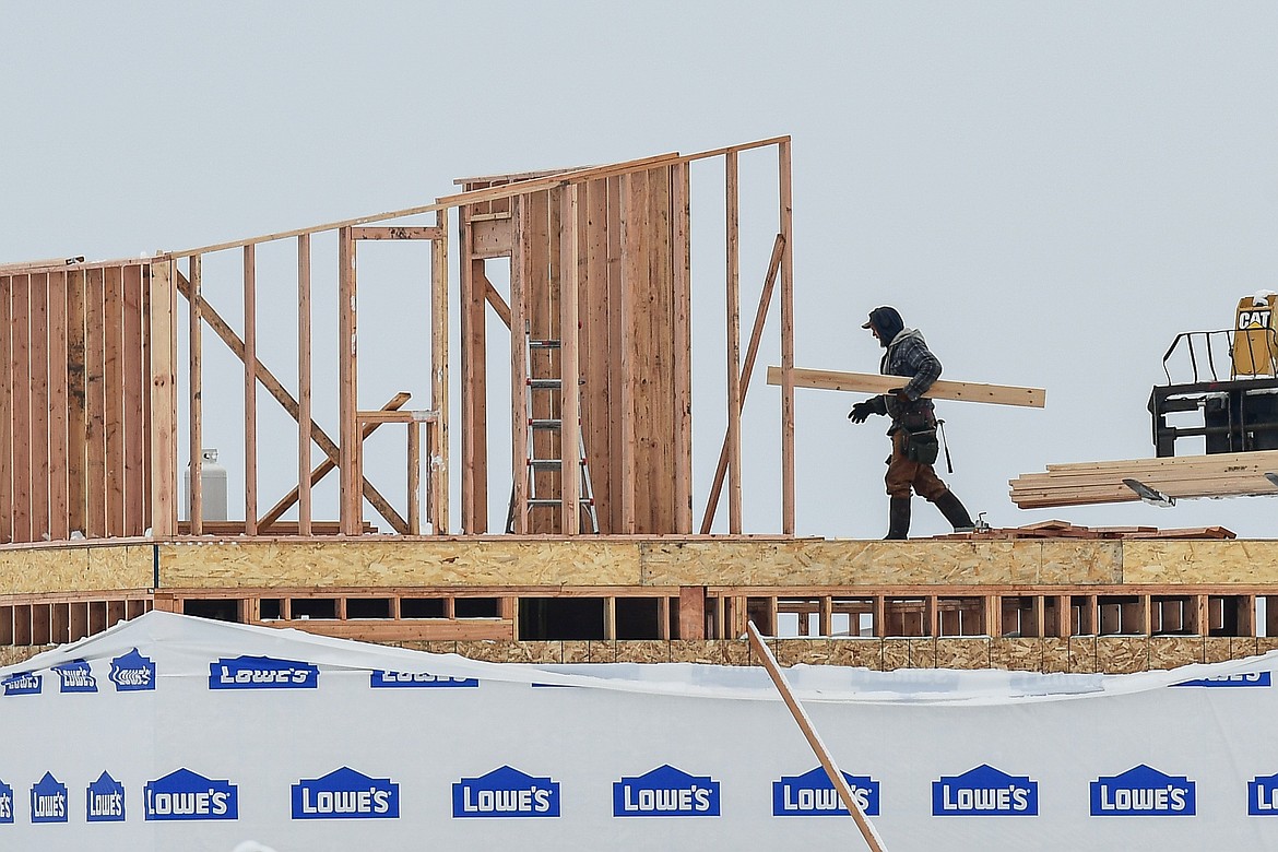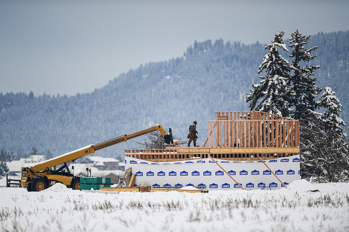 A builder works on a home along Farm to Market Road on Wednesday, Dec. 3. (Casey Kreider/Daily Inter Lake)