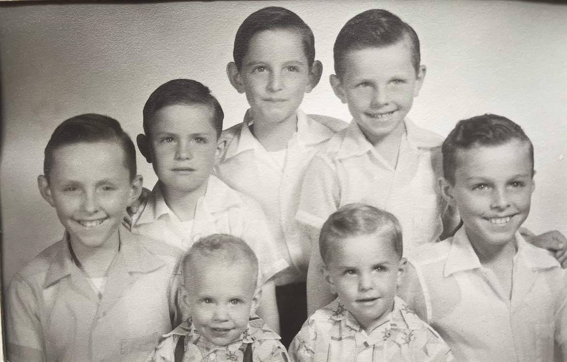 Son No. 2, Barry, remembers that the family would “make quite a splash” when six, seven, eight boys would pile out of the old red station wagon. He and Guy, as teenagers, felt a little awkward about the attention it would bring. Our beloved Aunt Marguerite saw their embarrassment and chewed them out for not being proud of their family.