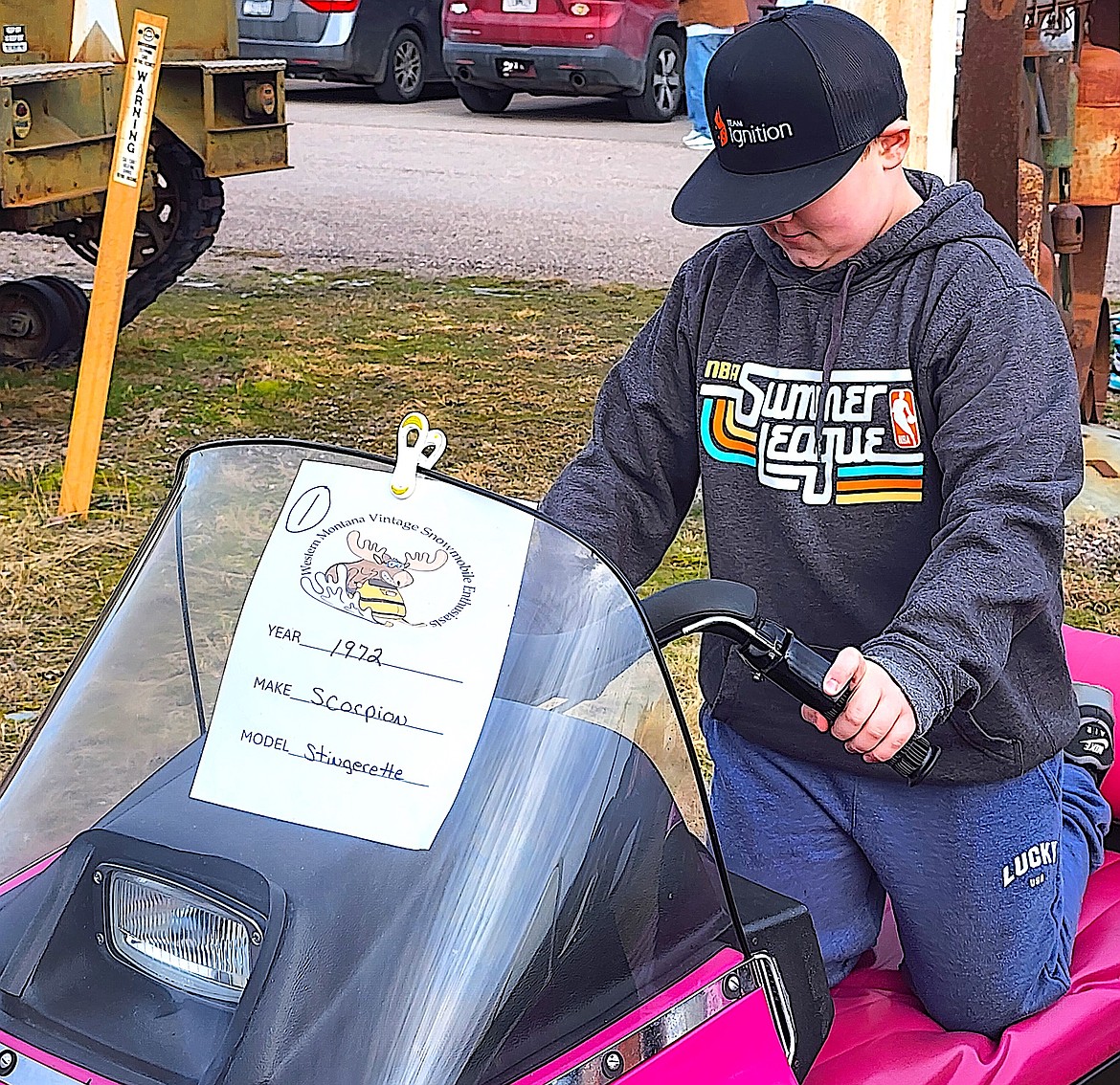 The Western Montana Vintage Snowmobile Enthusiasts brought a trailer full of sleds and were running a contest for visitors to select their favorite and slip a ballot in the box. Members of the group were on hand, answering questions.