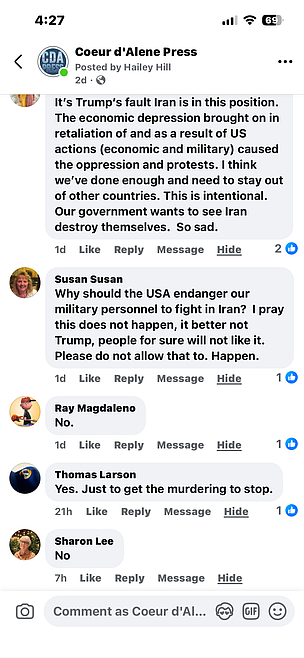 “I thought that Trump’s ‘America first’ mantra and not doing nation building (which) he campaigned on was something that he actually believed in,” wrote Thomas Hearn. “But the only thing he believes in is being the tough guy on the world stage. We need to stay out of Iran as we should other countries in the world unless they are directly threatening us.”