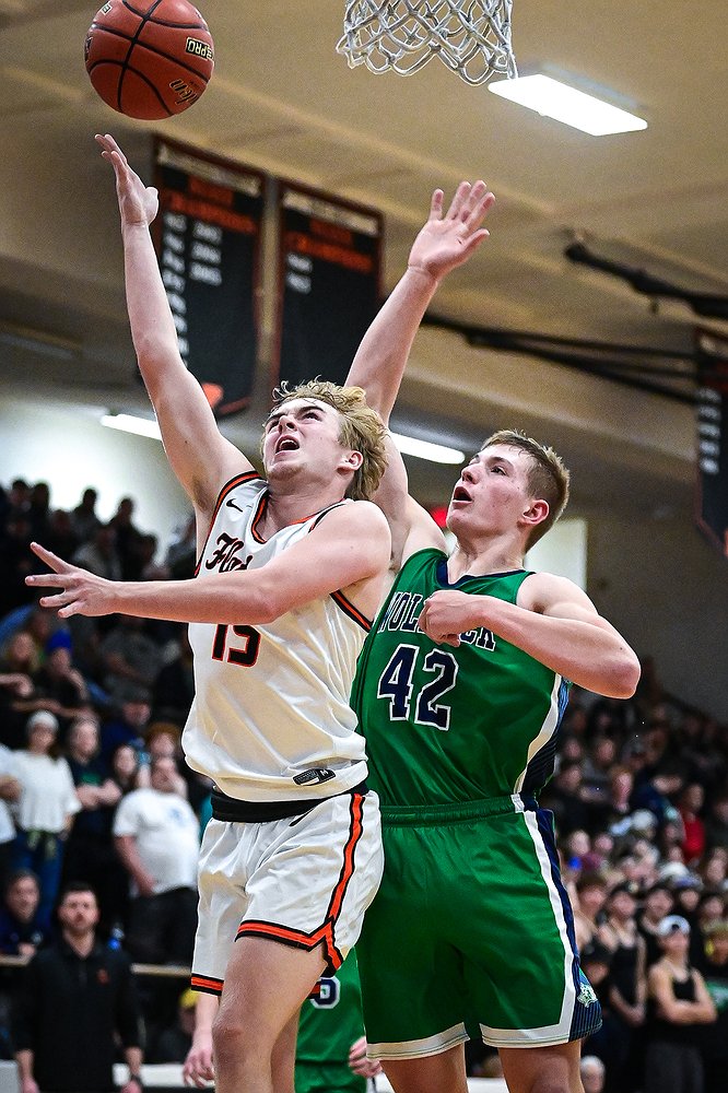 Ben Reichner had a chance to tie the game at the line with four seconds left but went 2 of 3 before Asher Knopik made it a two-point game with a free throw at the other end. Hunter Fann’s heave at the horn came up short for the Braves, who fell to 1-8 overall and 0-5 in Western AA games. Glacier sits at 4-6 overall and 1-4 in conference.