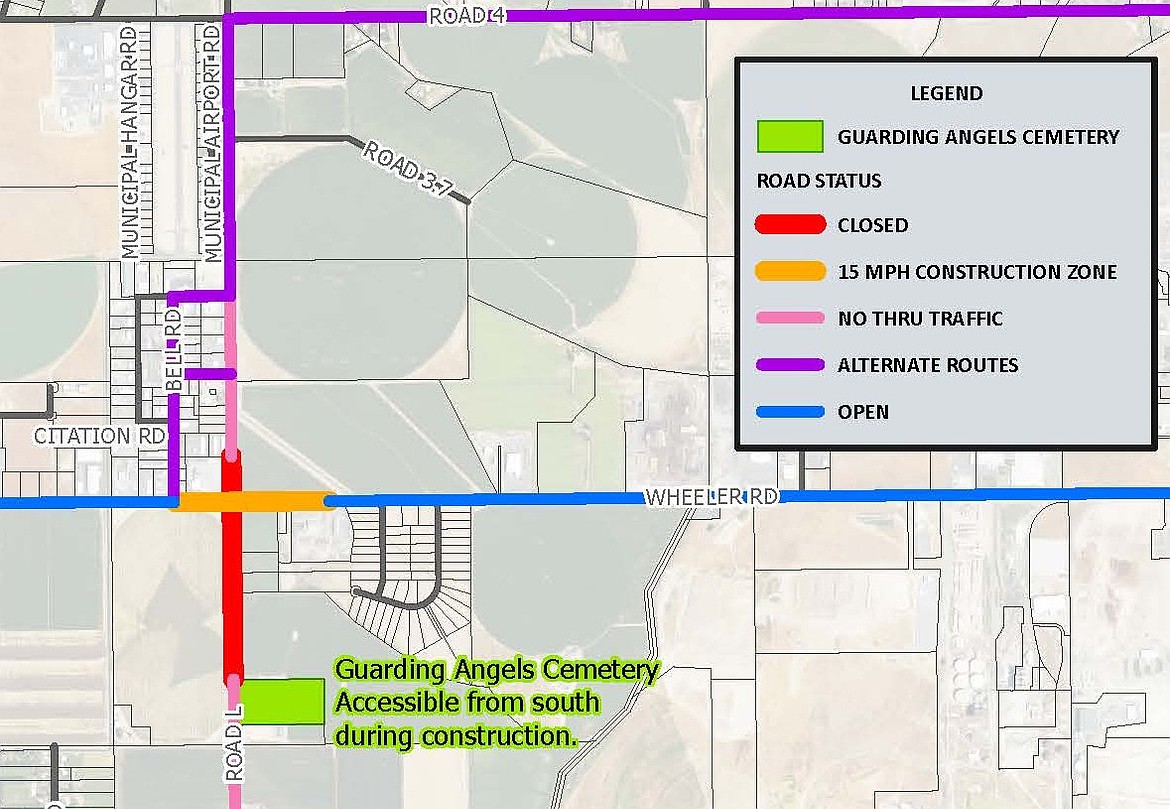 The closure north of Wheeler Road will extend to Debonair Street Northeast. The area can be accessed from Ball Road Northeast. South of Wheeler, Road L will be closed to the Guarding Angels Cemetery, 2595 Road L NE. People will still be able to access the cemetery from the south, Bisnett said. Road L Northeast has intersections with East Nelson Road and Kittleson Road Northeast, which will be the detours for people driving south, he said.