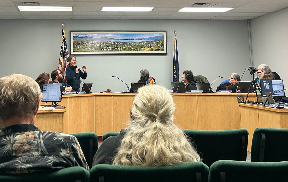 Commissioner Carolyn Pardini stands during the meeting, points to the lakeview photo on the commission chambers wall, and advocates against selling the Kootenai Avenue Right-of-Way. She explained that some type of development in this location would affect local residents' view of the lake. (Emily Messer/Leader)ARTICLES BY EMILY MESSER