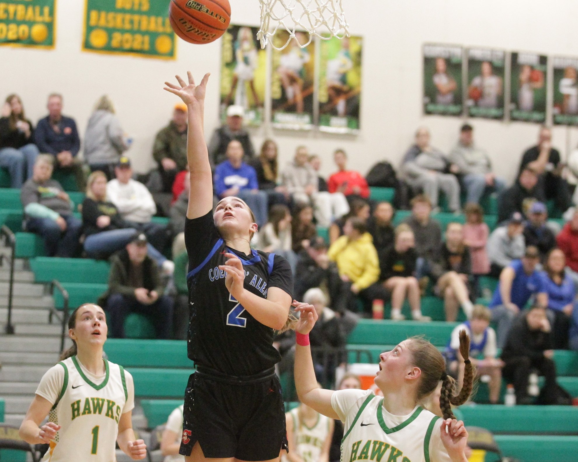 Junior Brookeslee Colvin scored 20 of her game-high 32 points in the first half for the Coeur d’Alene Vikings in a 75-64 win over the Lakeland Hawks at Hawk Court on Tuesday.