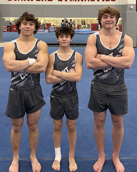Courtesy photo Avant Coeur Gymnastics Level 10s at the Stanford Open in Palo Alto, Calif. From left are Conan Tapia, Dylan Coulson and Lance Mosher.