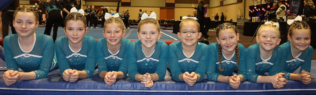 Courtesy photo Avant Coeur Gymnastics Level 4s at the Wine Country Classic in Kennewick, Wash. From left are Ava Wissman, Isla Moore, Vida Wohletz, Avery Brown, Harbor Romanosky, Paisley Moore, Lala Underdahl and Shay Bridges.