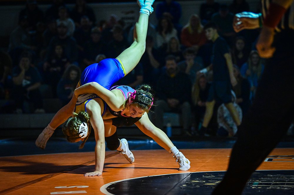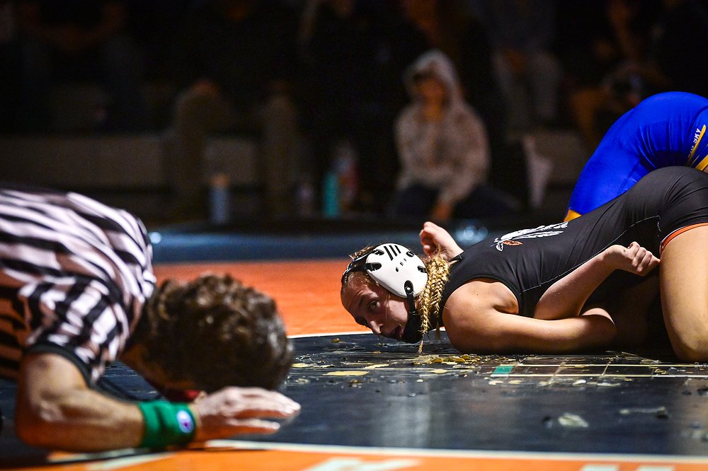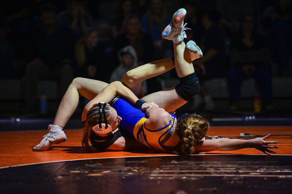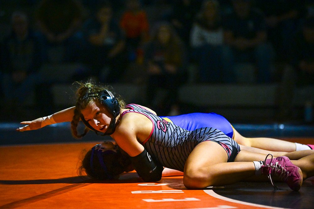 Flathead's Bella Downing works toward a pin of Missoula Big Sky's Mackenzie Harcrow at 120 lbs. at Flathead High School on Thursday, Jan. 29. (Casey Kreider/Daily Inter Lake)