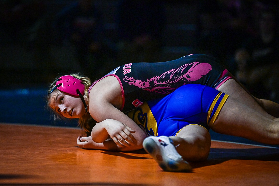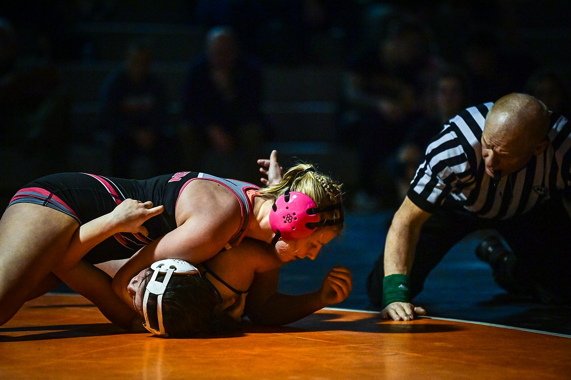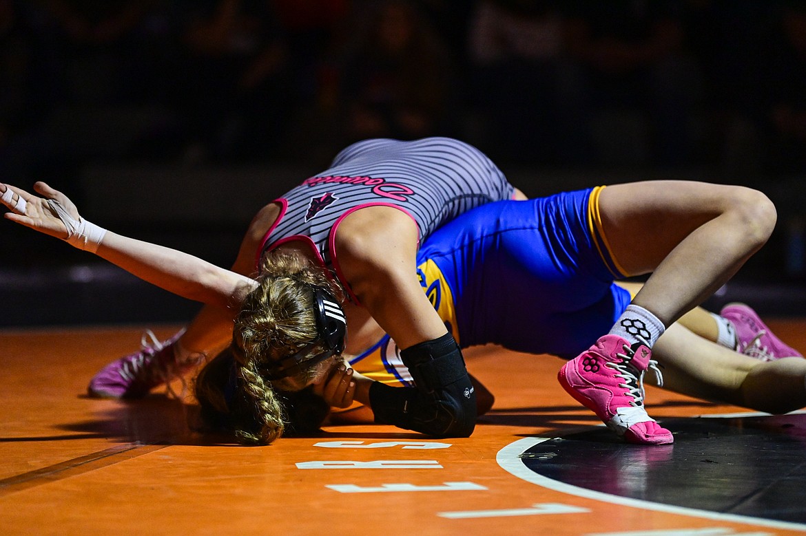 Flathead's Haley Wilson works toward a pin of MIssoula Big Sky's Kelly Hart at 145 lbs. at Flathead High School on Thursday, Jan. 29. (Casey Kreider/Daily Inter Lake)