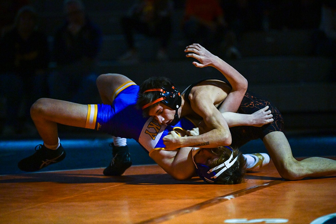Flathead's Hunter Arriaga wrestles Missoula Big Sky's Riley Youngblood at 144 lbs. at Flathead High School on Thursday, Jan. 29. (Casey Kreider/Daily Inter Lake)