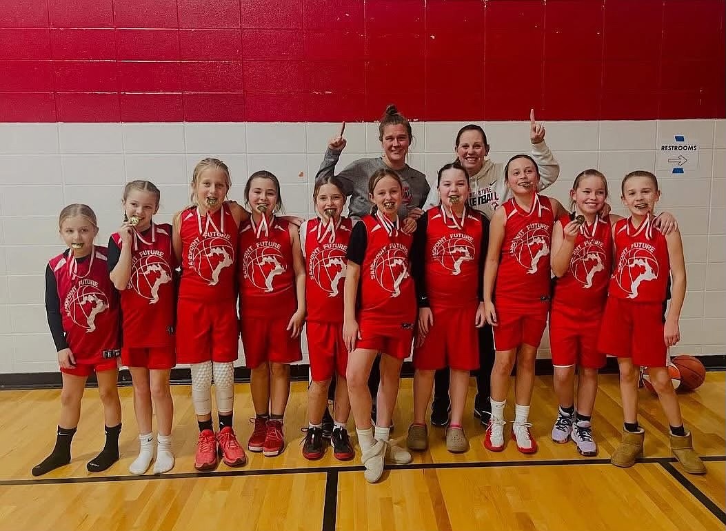 Full caption: The Sandpoint Future 4th Grade Girls basketball team won the Sandpoint Future Invitational — their fourth straight tournament win — held Saturday and Sunday at various locations throughout the Greater Sandpoint Area. The team, playing at Farmin Stidwell Elementary, beat the Lakeland Elite (23-16) before losing their first game since early November to the Spokane Nets (21-20) on Saturday. The girls bounced back on Sunday to defeat the CDA Stars (20-14) and then avenged their loss by defeating the Spokane Nets (26-20) in the championship game. Pictured, back row, from left are coaches Karly Malone & Amanda Skinner. Front row, from left are Gracie Fields, Juli Driggs, Harper DeNeui, Estelle Skinner, Evelyn Brawley, Remi Lowther, Presley VonderAhe, Kate Thielbahr, Lily Savage and Brynn Malone.