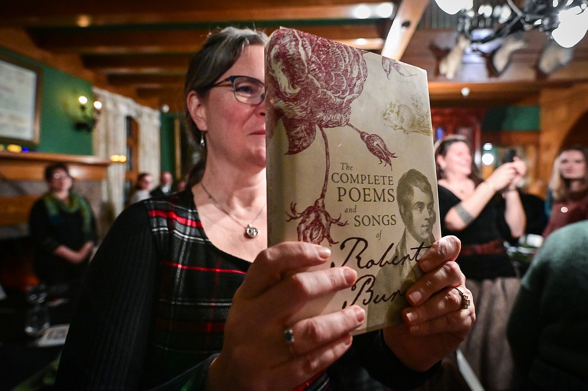 Shelley Eberhardy carries a "The Complete Poems and Songs of Robert Burns" during an opening welcome procession at the Burns Night Supper, honoring the life and poetry of Scottish poet Robert Burns, held by the Flathead Celtic Society at Conrad Mansion in Kalispell on Saturday, Jan. 24, 2026. (Casey Kreider/Daily Inter Lake)