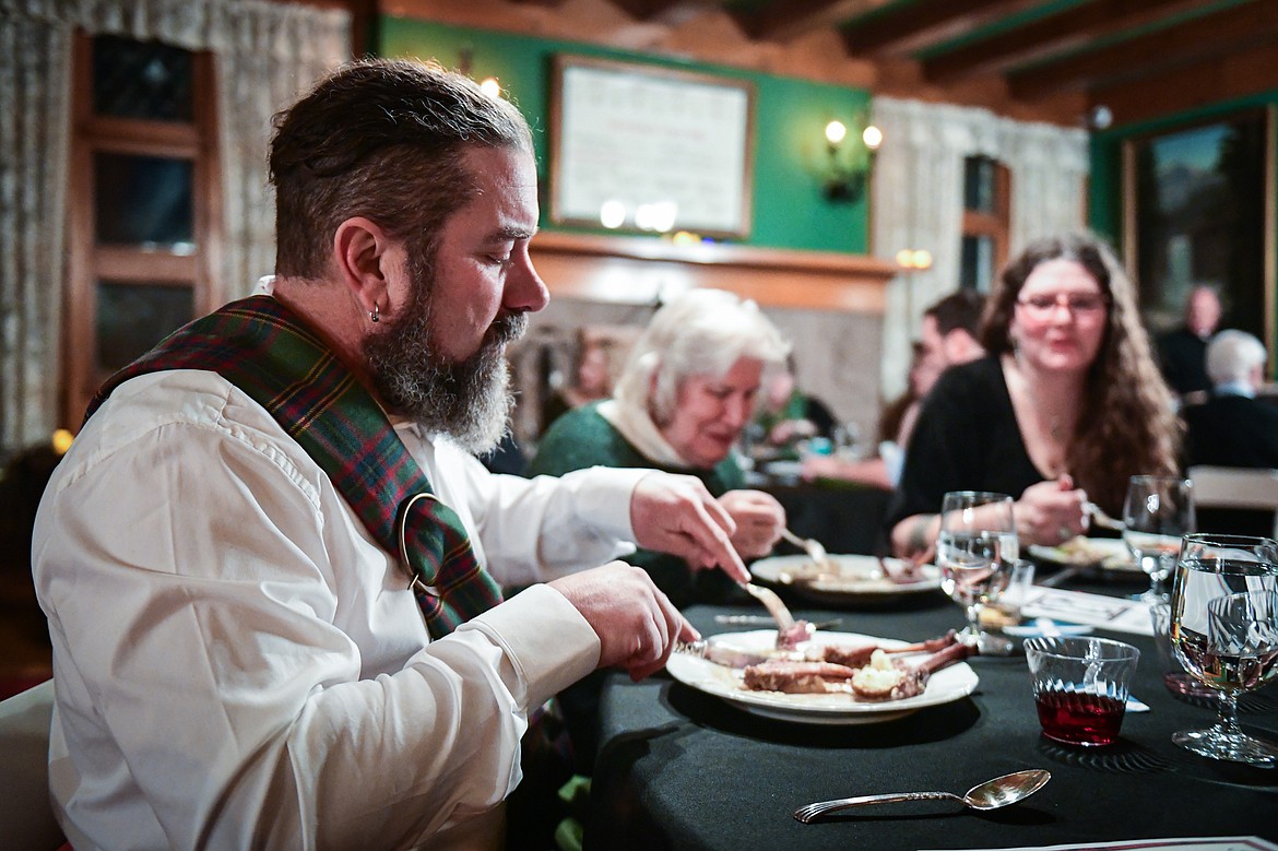 Ken Ruprecht enjoys his entree of lamb chops at the Burns Night Supper, honoring the life and poetry of Scottish poet Robert Burns, held by the Flathead Celtic Society at Conrad Mansion in Kalispell on Saturday, Jan. 24, 2026. (Casey Kreider/Daily Inter Lake)