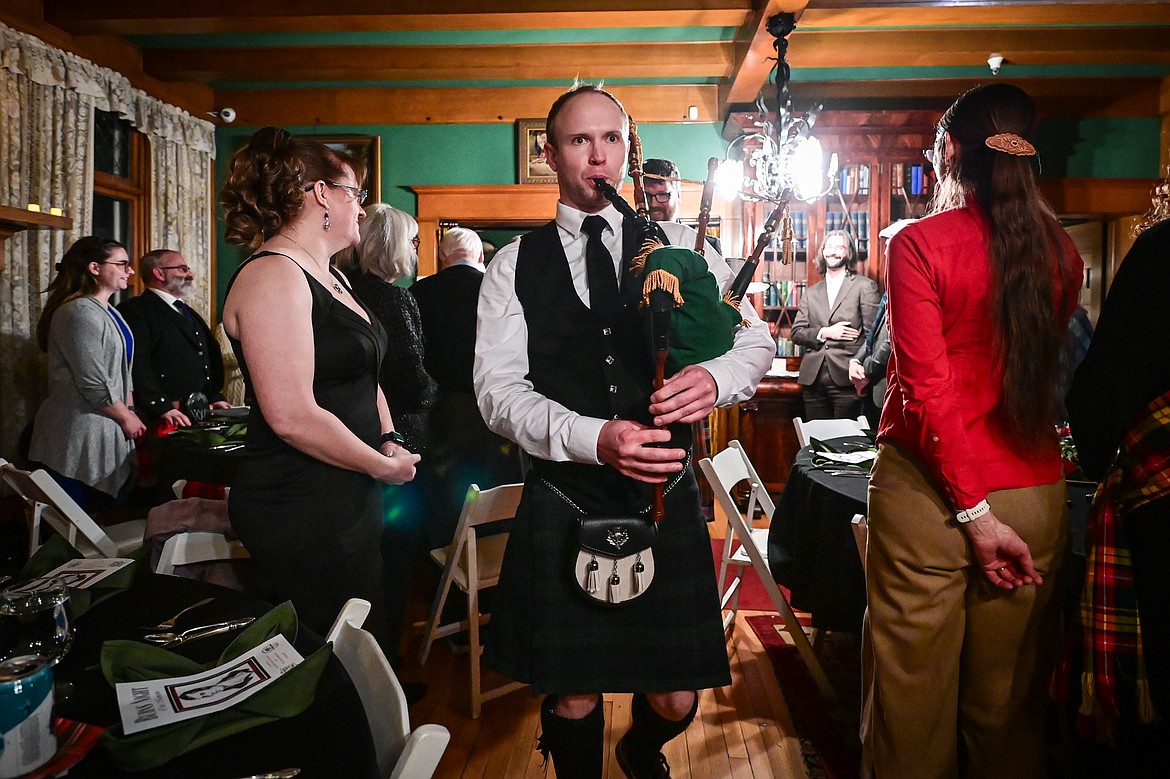 Ryan Street plays the bagpipes for attendees gathered for the Burns Night Supper, honoring the life and poetry of Scottish poet Robert Burns, held by the Flathead Celtic Society at Conrad Mansion in Kalispell on Saturday, Jan. 24, 2026. (Casey Kreider/Daily Inter Lake)