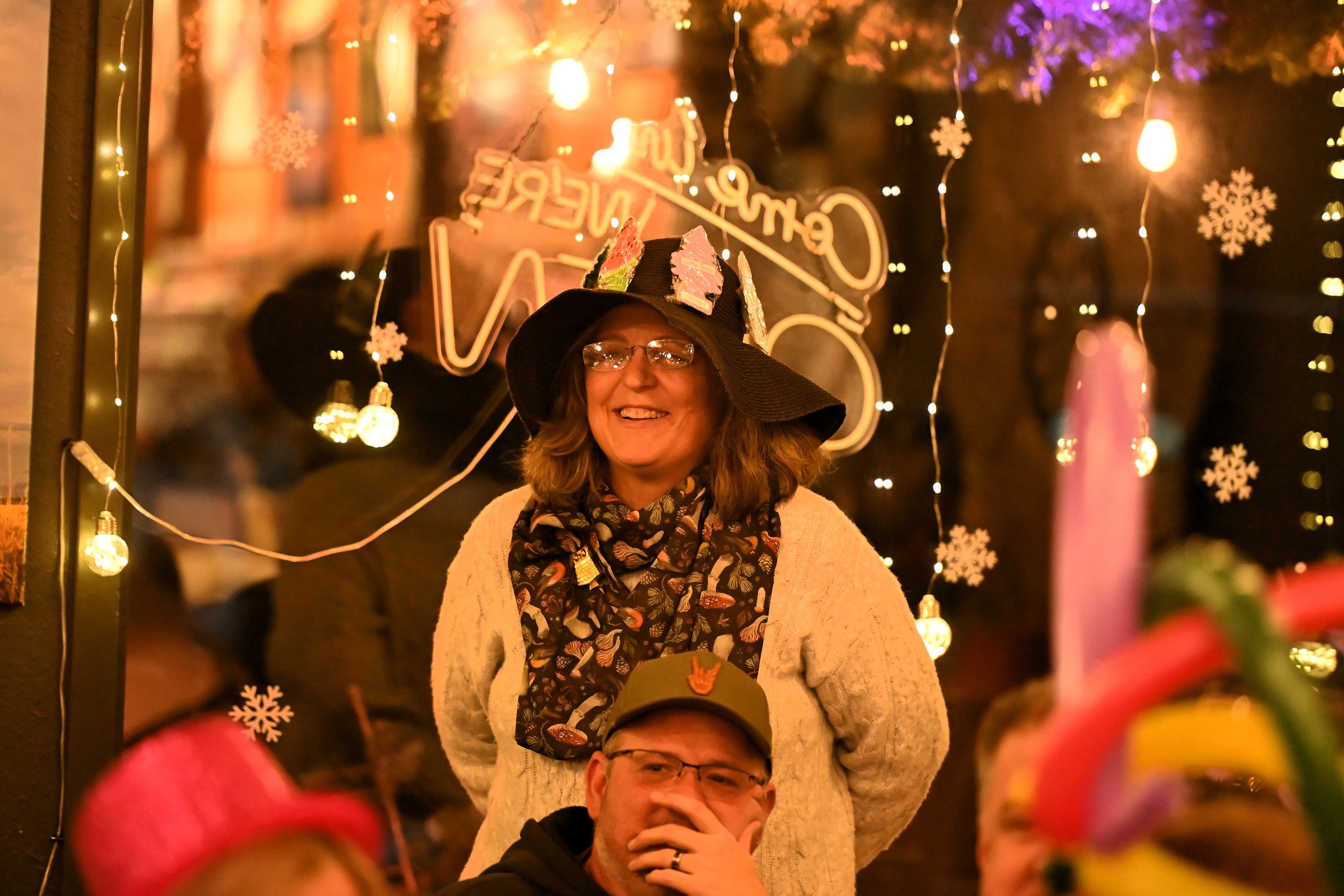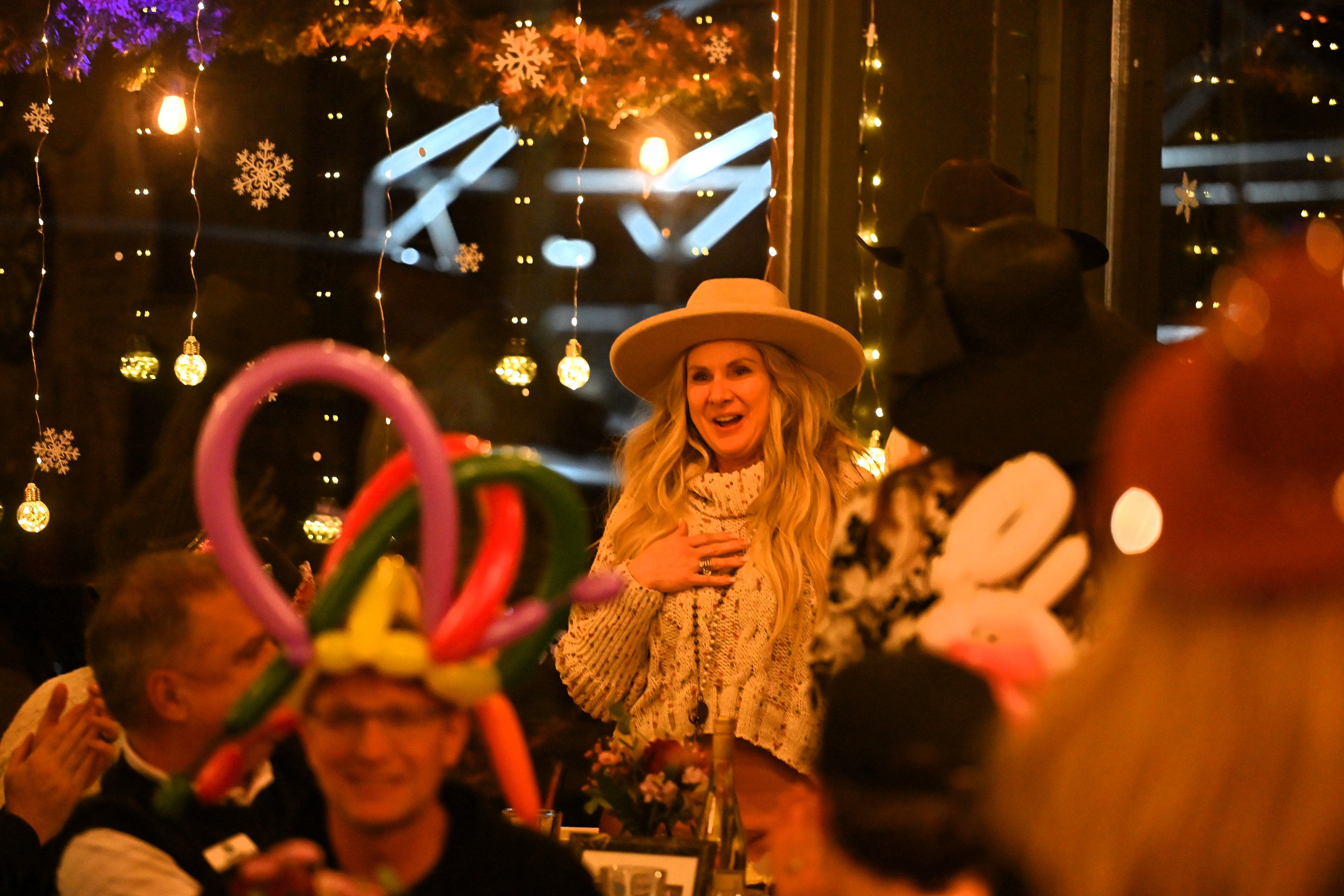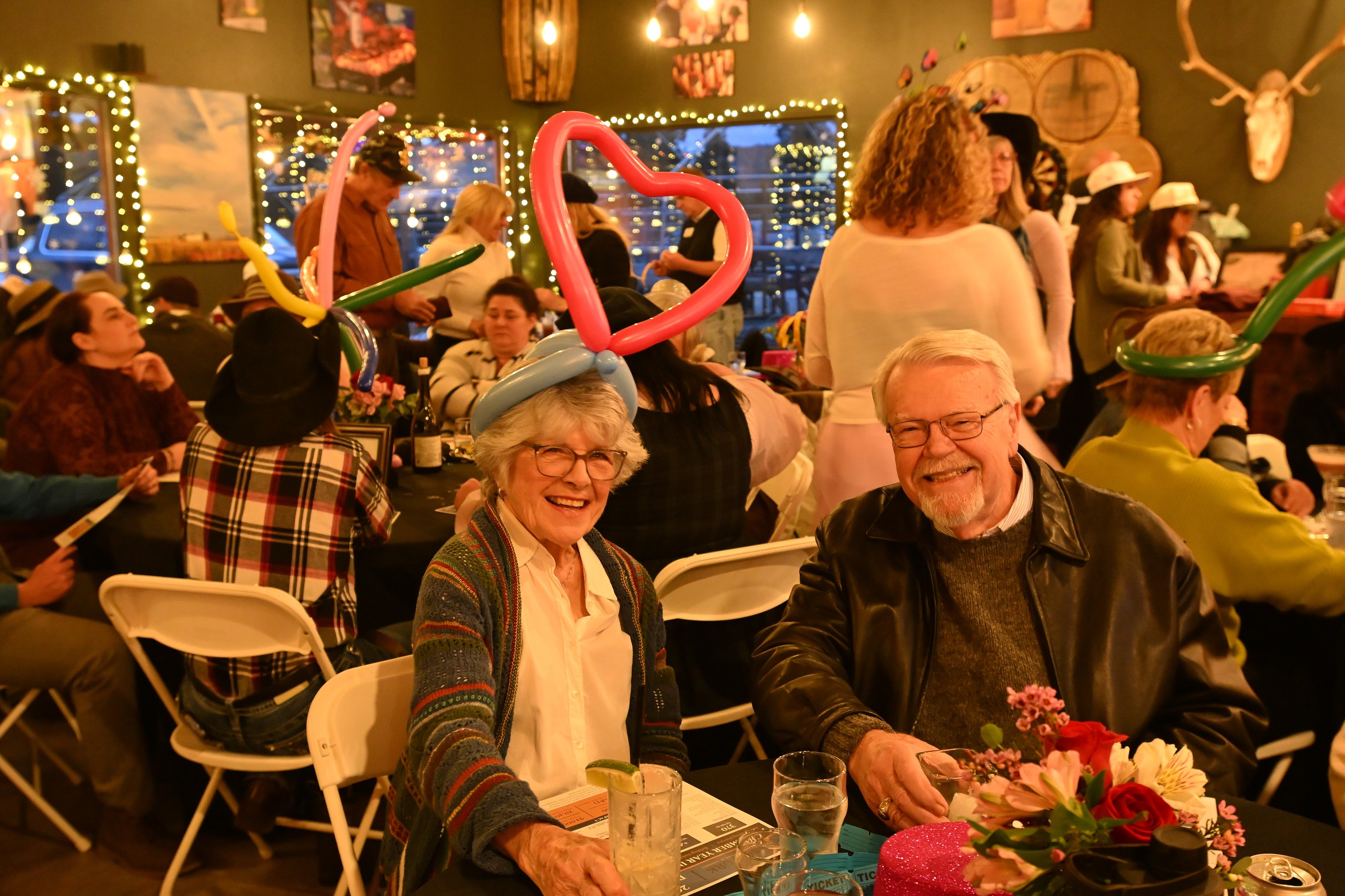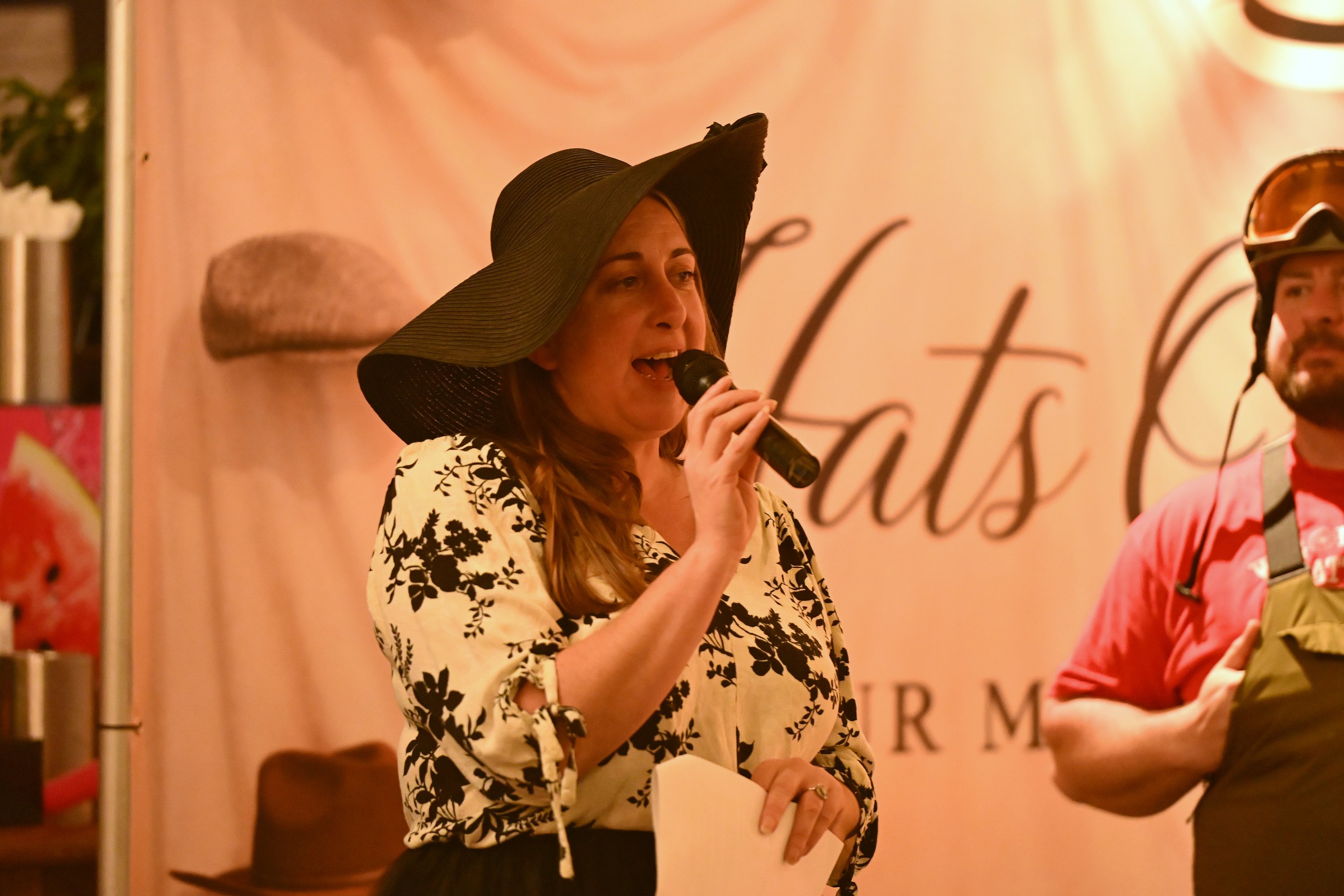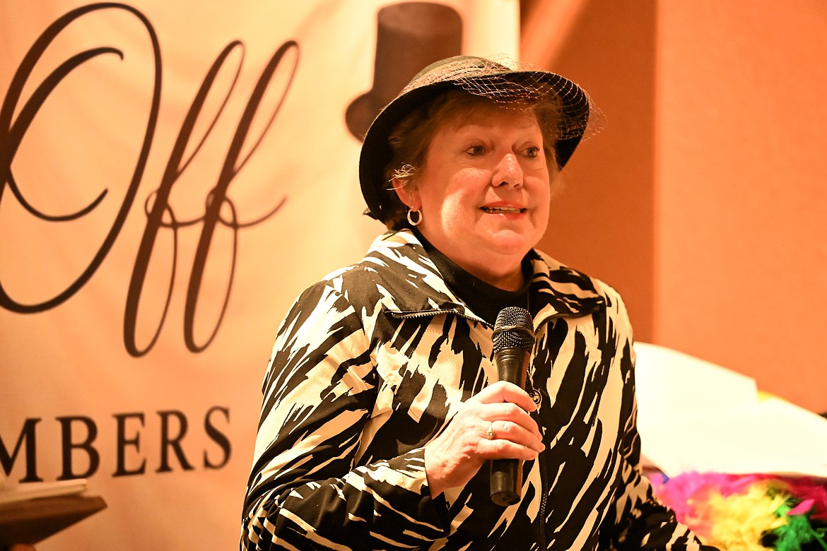 Liana Orsolini takes part in the hat contest at the Bigfork Chamber's annual awards banquet on Wednesday, Feb. 25 at Andy's Crafthouse in Bigfork. (Matt Baldwin/Bigfork Eagle)