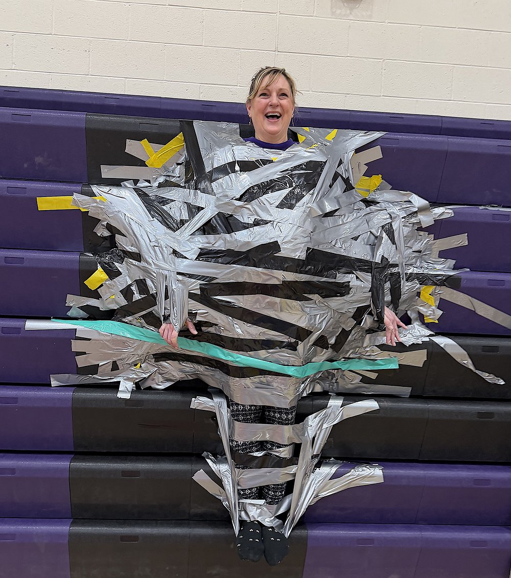 It worked. When the stool was removed, she dangled against the bleachers for about 10 minutes while the students cheered their accomplishment. A trio of staff members – “bodyguards” Camas McClure, Ian Donovan and Adam Burke – stood nearby to prevent her from falling on her face if the duct tape failed.