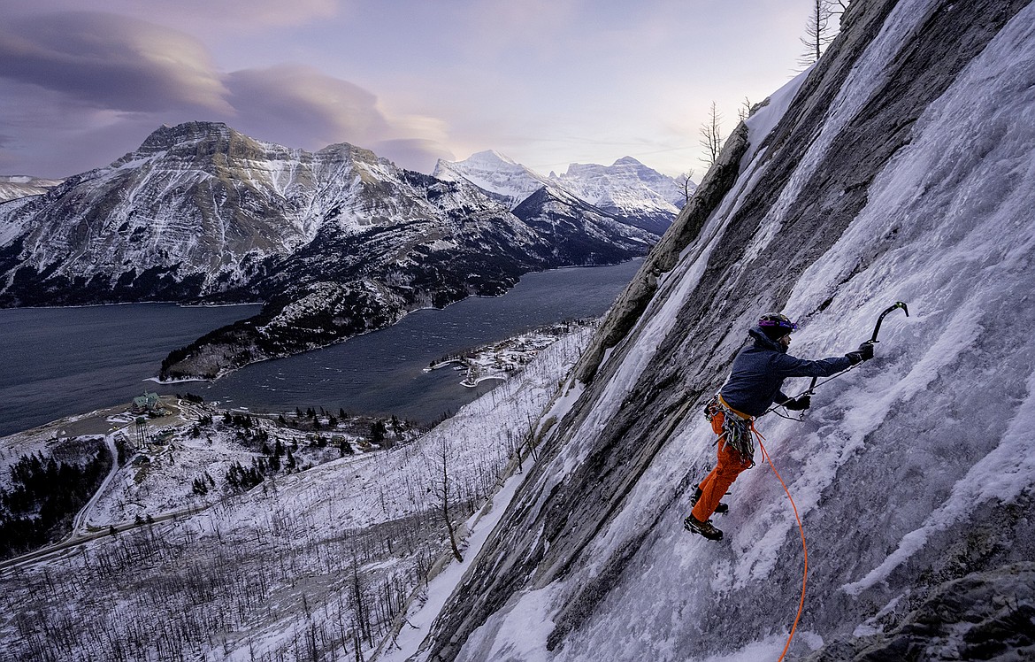 Recharging with a coffee from the only storefront open in the Waterton townsite, we scanned the nearby cliff sides above town. Through the binoculars we spotted an ephemeral ice smear clinging to a tilted slab of rock.