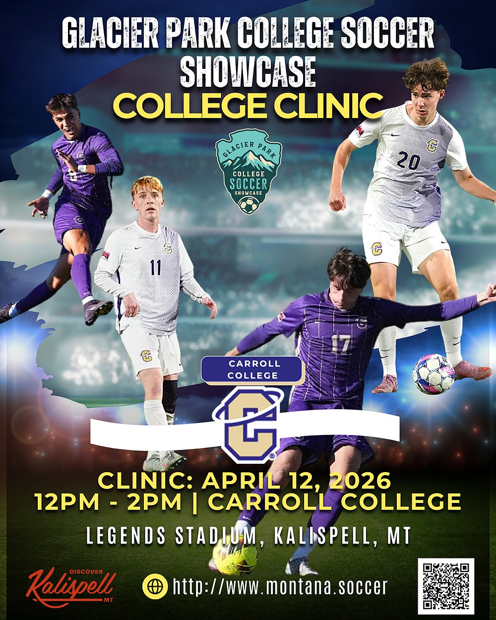 A College Clinic will be hosted by the Carroll College men's team on Sunday, April 12 from noon – 2 p.m. at Legends Stadium. This two-hour clinic is for boys and girls from 5-18 years old and costs $50. Players will be divided by age and skill level for more individualized instruction.