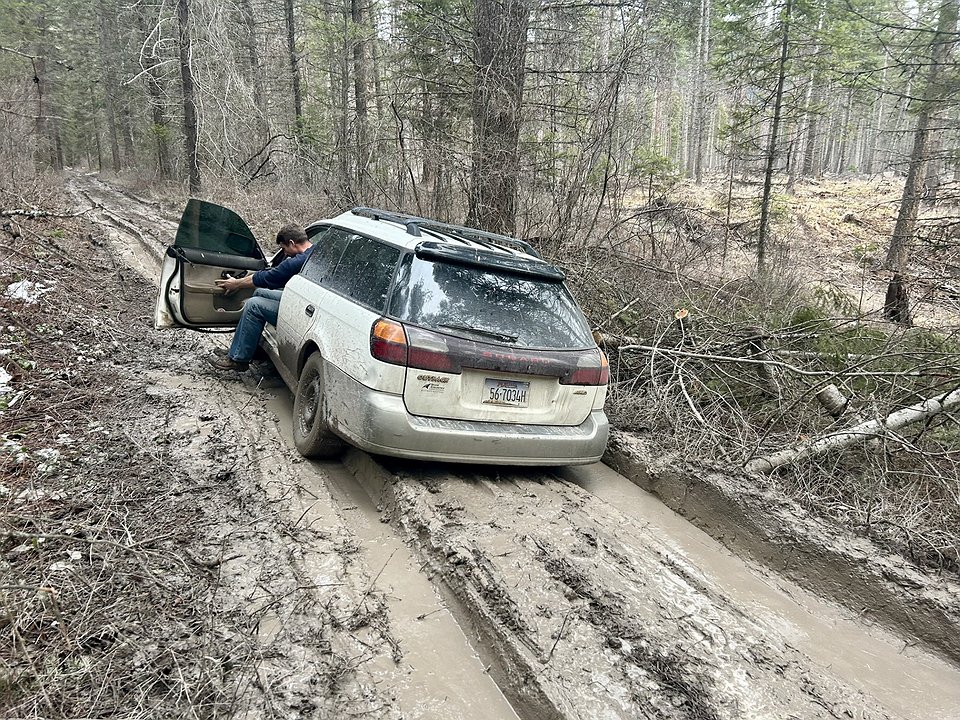 The 2001 Outback Subaru revved as its oversized tires slipped on the mud, slick from rain and melted snow. The ruts under the car were a foot deep. Wheels spun in the water.