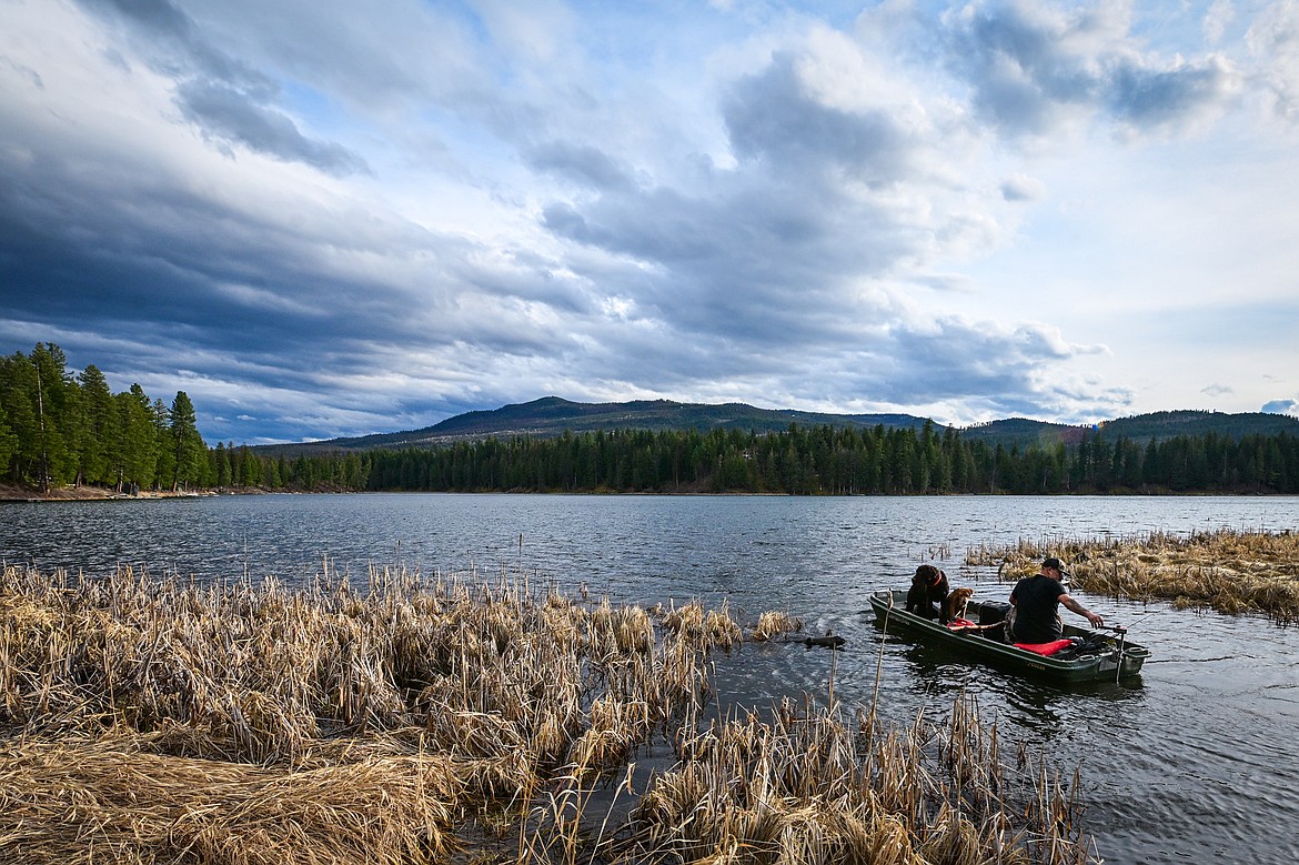 A fisherman heads out onto Loon Lake in Ferndale with his two dogs on Friday, March 20. (Casey Kreider/Daily Inter Lake)